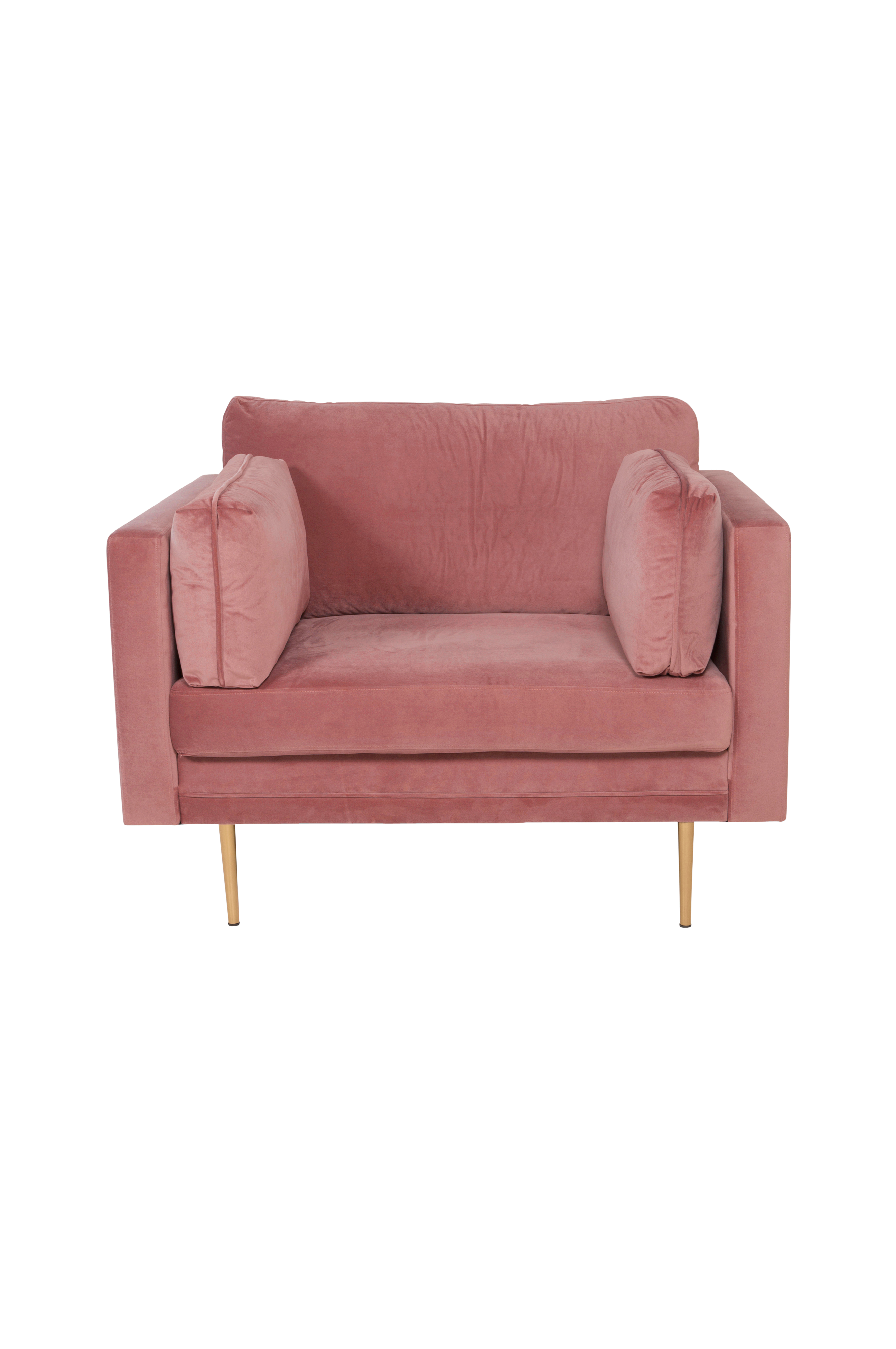 Mukava nojatuoli samettia ja messinginväriset metallijalat. Puurunko ja istuin, jossa nozag-jouset ja vaahtomuovia. Martindale-arvo > 10 000. Istuinleveys 88 cm. Etäisyys lattiasta käsinojaan 70 cm. Jalkojen korkeus 20,5 cm. Istuinpehmusteiden paksuus 15 cm, selkäpehmusteiden 20,5 cm. Asenna jalat itse.