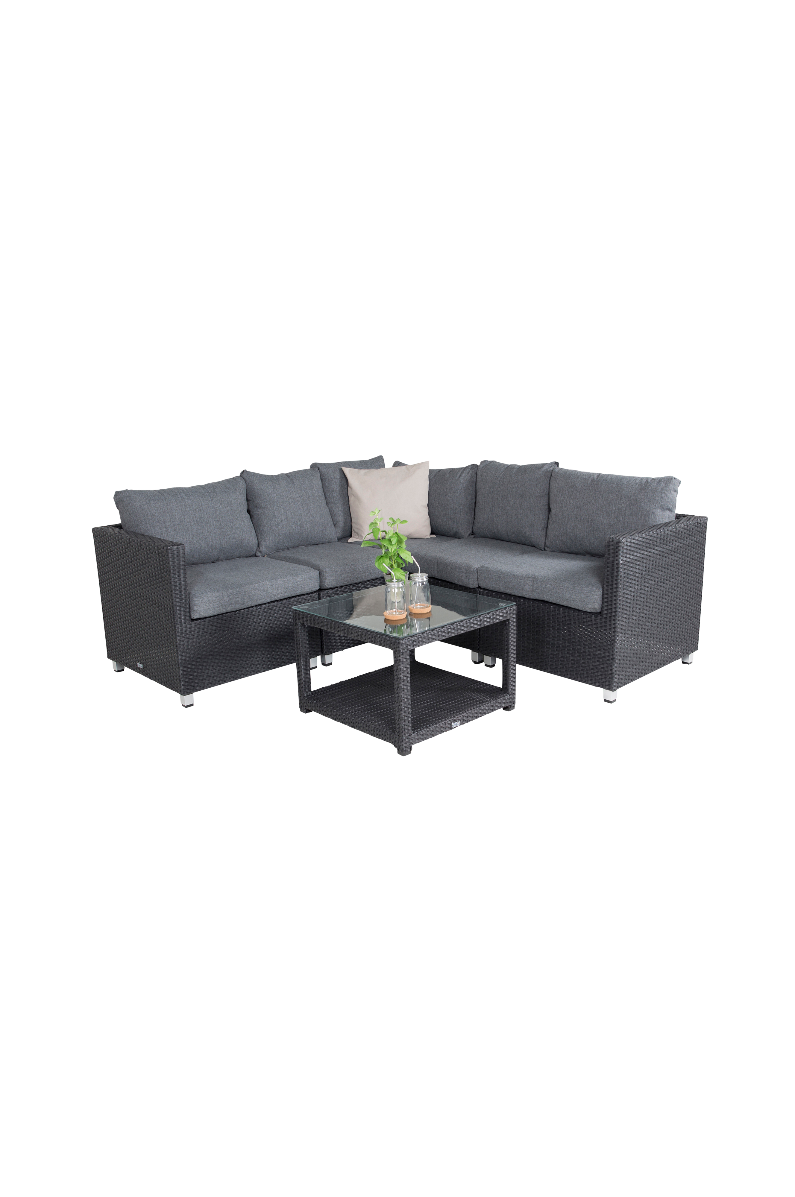Modernin tyylikäs sohvaryhmä terassille. Sohvaryhmä koostuu moduulimallisesta kulmasohvasta, jossa on tilaa neljälle hengelle, ja kulmaosasta, joka on helppo sijoittaa omien toiveiden mukaan. Mukana tummat pehmusteet ja matalahko sohvapöytä, jossa on hyllytaso ja lasinen pöytälevy. Valmistettu polyrottingista, runko metallia.