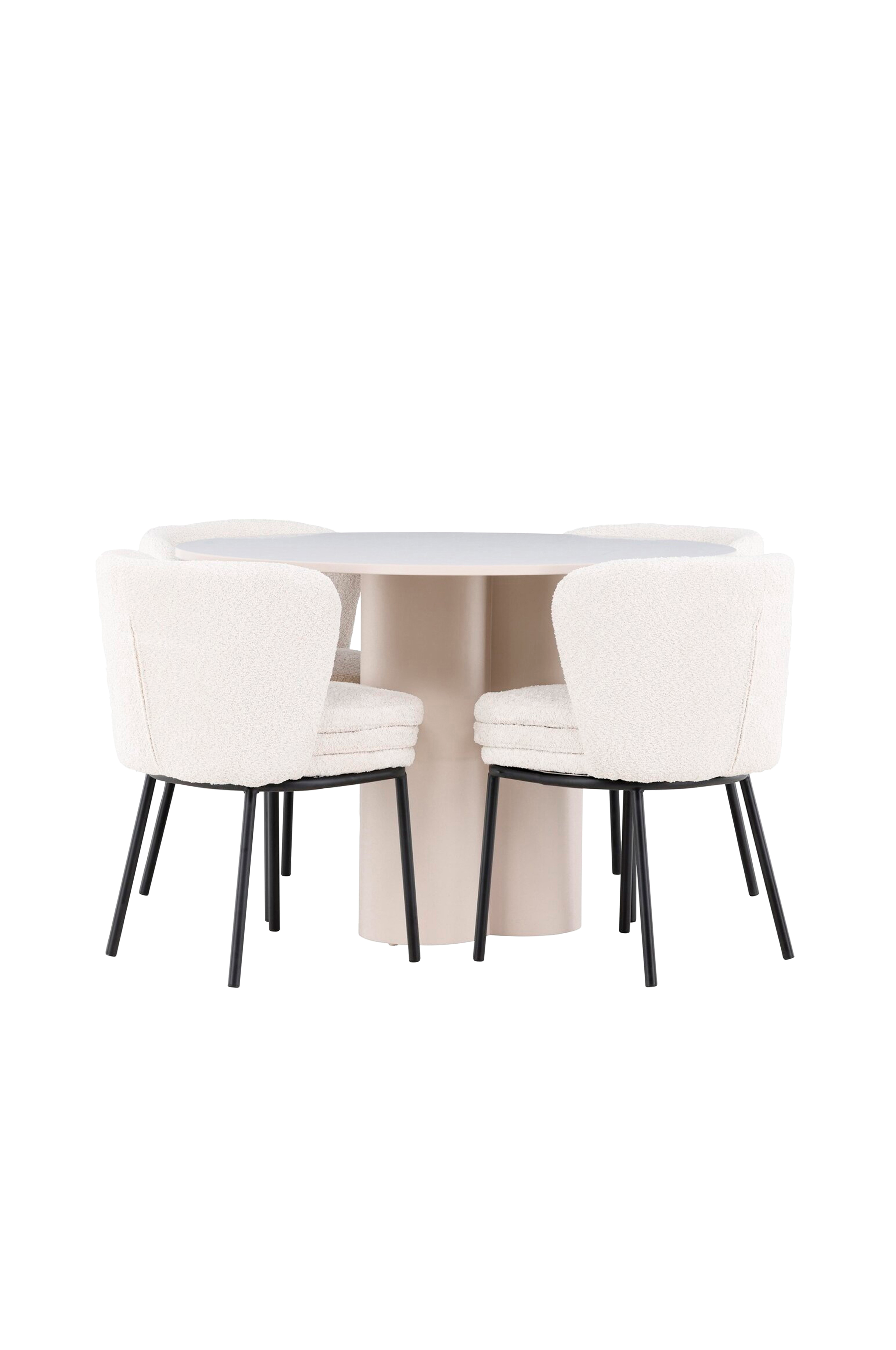 Luo tyylikäs ja kutsuva ruokailutila hienostuneella ruokailuryhmällämme, jossa yhdistyvät Olivia-pöytä ja ylelliset Agnes-tuolit. Tämä ruokailuryhmä sopii täydellisesti sekä arki-illallisille että juhlallisiin tilaisuuksiin, ja se antaa ruokasalillesi modernin ja harmonisen tunnelman. Mdf-levystä valmistettu olivia-pöytä tuo ruokailuhuoneeseesi lämpimän ja kutsuvan tunnelman. Pöydän halkaisija on 110 cm, joten siinä on runsaasti tilaa ruoalle ja keskusteluille, ja sen pyöreä muoto luo tasapainoisen ja sosiaalisen ympäristön. Pöydän tukeva rakenne takaa pitkäaikaisen käytön ja vakauden. Neljä Agnes-tuolia täydentävät pöytää täydellisesti tyylikkäillä, bukleella päällystetyillä istuimillaan. Nämä tuolit tarjoavat sekä mukavuutta että tyyliä, joten ne sopivat erinomaisesti pitkiin, nautinnollisiin illallisiin perheen ja ystävien kanssa. Niiden moderni muotoilu korkeilla selkänojilla ja pehmeillä istuimilla antaa ruokasalillesi hienostuneen ja nykyaikaisen ilmeen. Tämä ruokailuryhmä on täydellinen yhdistelmä estetiikkaa ja toiminnallisuutta, joten se on erinomainen valinta niille, jotka etsivät tyylikästä ja mukavaa ruokailutilaa. Päivitä ruokasalisi Olivia-pöydän ja Agnes-tuolien yhdistelmällä ja luo paikka, jossa muistot ja ilo jaetaan.