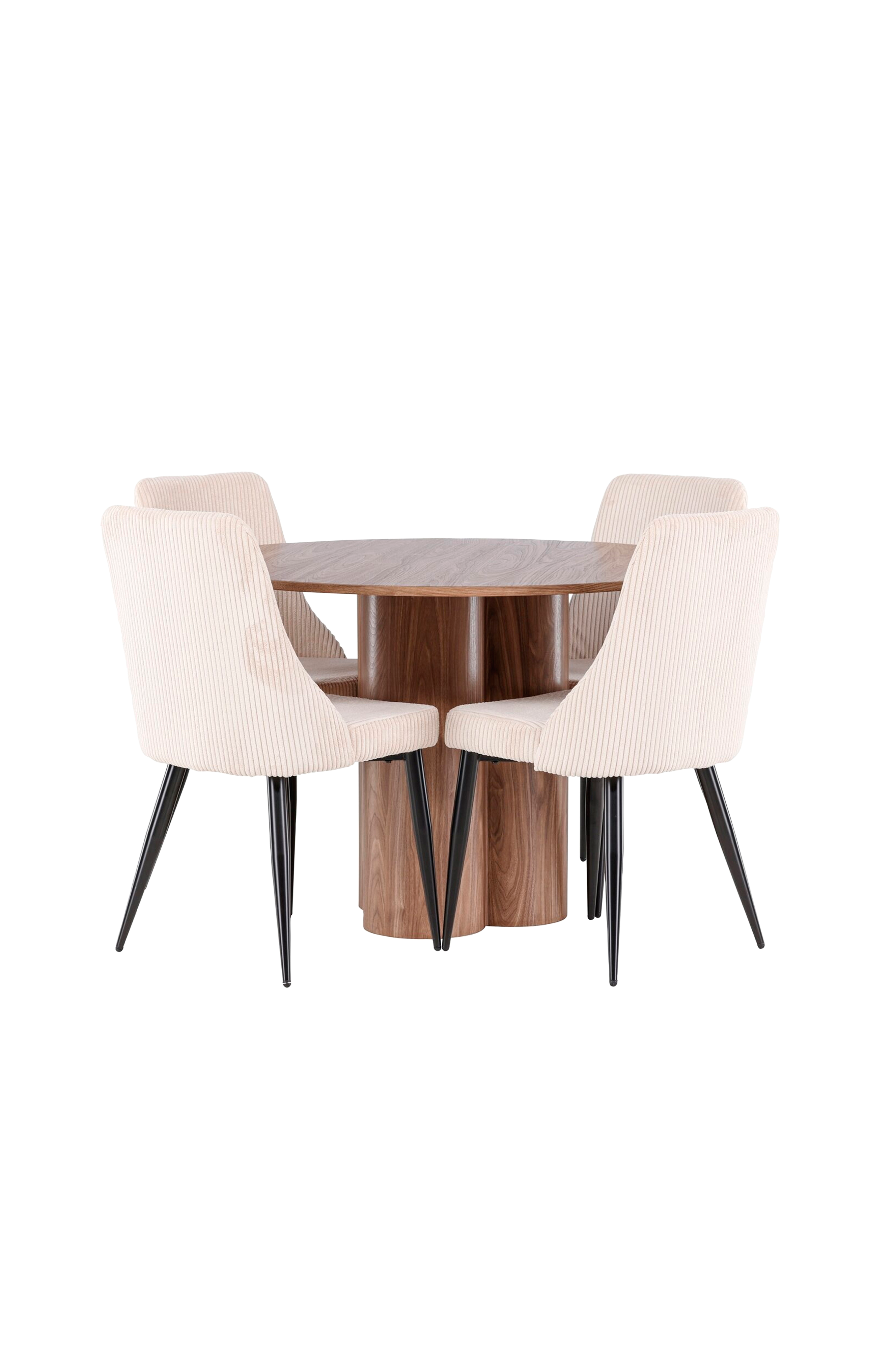 Luo kutsuva ja tyylikäs ruokailutila tyylikkäällä ruokailusarjalla, joka sisältää Olivia-pöydän ja Leone-tuolit. Tämä ruokailusetti on täydellinen yhdistelmä modernia muotoilua ja klassista mukavuutta, joten se sopii erinomaisesti sekä jokapäiväisiin aterioihin että juhlatilaisuuksiin. Olivia-pöytä on tyylikäs ja ajaton lisä kotiisi. Tukevan mdf-rakenteensa ansiosta pöytä antaa lämpimän ja kutsuvan vaikutelman. Pöytälevyn halkaisija on 110 cm, joten se on riittävän tilava, jotta siihen mahtuu mukavasti neljä henkilöä, mutta samalla se on riittävän kompakti mahtuakseen pienempiin tiloihin. Olivia-pöytä seisoo vakaasti tukevalla jalustallaan ja on helppo puhdistaa, joten se on sekä käytännöllinen että tyylikäs. Täydennä olivia-pöytää neljällä tyylikkäällä leone-tuolilla, jotka on verhoiltu ylellisellä korduroylla. Nämä tuolit tarjoavat esteettisesti miellyttävän muotoilun lisäksi myös korkeaa mukavuutta pehmeän ja kestävän verhoilun ansiosta. Neutraali sävy sopii täydellisesti yhteen pöydän ulkonäön kanssa ja luo osaltaan harmonisen ja hienostuneen ilmapiirin ruokasaliisi. Leone-tuoleissa on huomioitu sekä tyyli että ergonomia, joten niissä on mukava istua pitkienkin illallisten aikana. Olivia-ruokailusarjan ja leone-tuolien avulla saat täydellisen ruokailutilan, jossa yhdistyvät toiminnallisuus ja tyylikäs muotoilu. Tästä ruokailusarjasta tulee epäilemättä kotisi keskeinen kohta, jonne perhe ja ystävät voivat kokoontua nauttimaan herkullisista aterioista ja miellyttävästä seurasta.