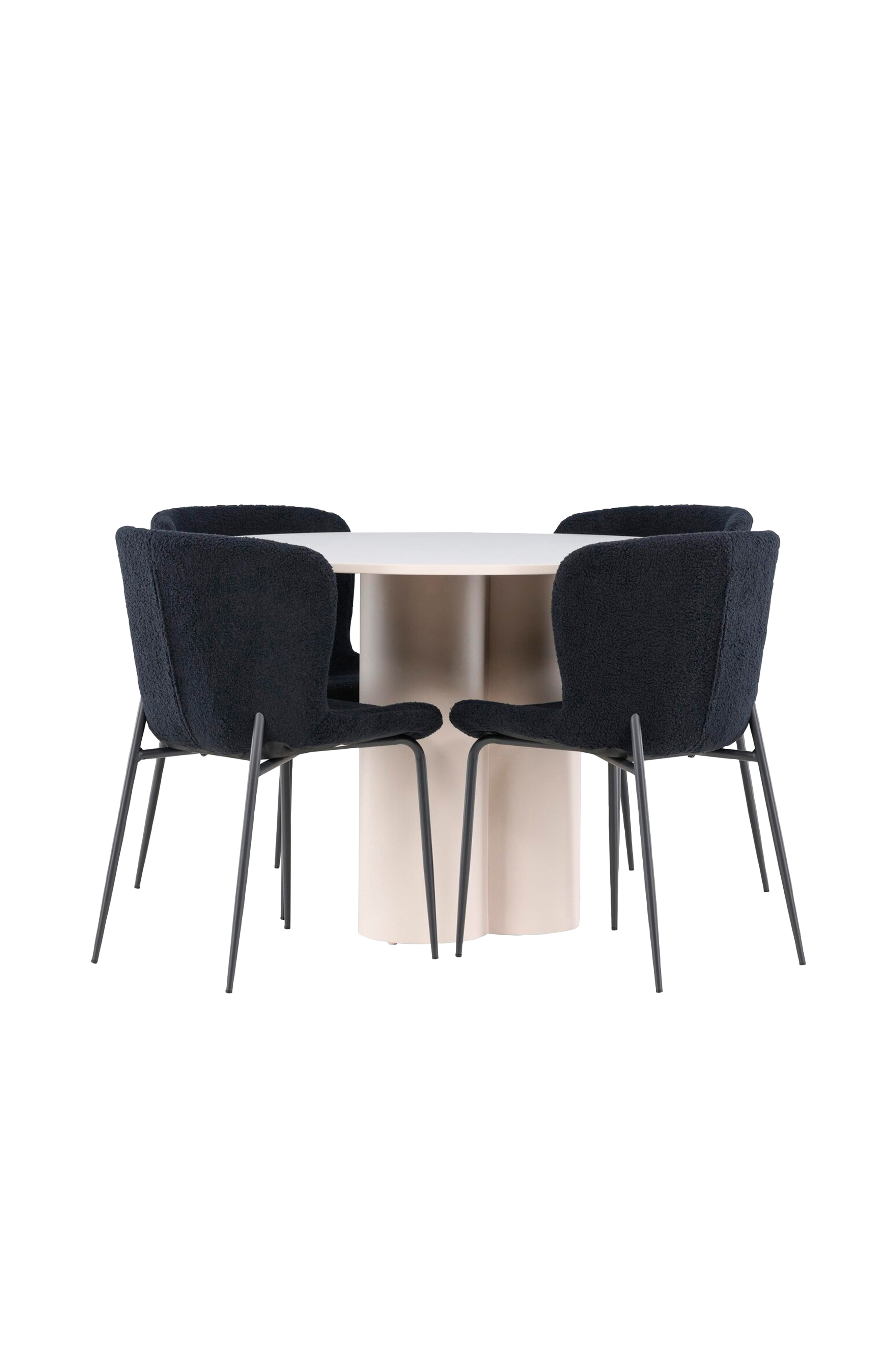 Luo tyylikäs ja kutsuva ruokailutila hienostuneella ruokailuryhmällämme, jossa yhdistyvät Olivia-pöytä ja tyylikkäät Modesto-tuolit. Tämä ruokailuryhmä sopii täydellisesti sekä arki-illallisille että juhlallisiin tilaisuuksiin, ja se antaa ruokasalillesi modernin ja harmonisen tunnelman. Mdf-levystä valmistettu olivia-pöytä tuo ruokailuhuoneeseesi lämpimän ja kutsuvan tunnelman. Halkaisijaltaan 110 cm:n pöytä tarjoaa runsaasti tilaa ruoalle ja keskusteluille, ja sen pyöreä muoto luo tasapainoisen ja sosiaalisen ympäristön. Pöydän tukeva rakenne takaa pitkäaikaisen käytön ja vakauden. Neljä Modesto-tuolia täydentävät pöytää täydellisesti tyylikkäillä istuimillaan, jotka on päällystetty polyesteriteddyllä. Nämä tuolit tarjoavat sekä mukavuutta että tyyliä, joten ne sopivat erinomaisesti pitkiin, nautinnollisiin illallisiin perheen ja ystävien kanssa. Niiden moderni muotoilu korkeilla selkänojilla ja pehmeillä istuimilla antaa ruokasalillesi hienostuneen ja nykyaikaisen ilmeen. Tämä ruokailuryhmä on täydellinen yhdistelmä estetiikkaa ja toiminnallisuutta, joten se on erinomainen valinta niille, jotka etsivät tyylikästä ja mukavaa ruokailutilaa. Päivitä ruokasalisi Olivia-pöydän ja Modesto-tuolien yhdistelmällä ja luo paikka, jossa muistot ja ilo jaetaan.