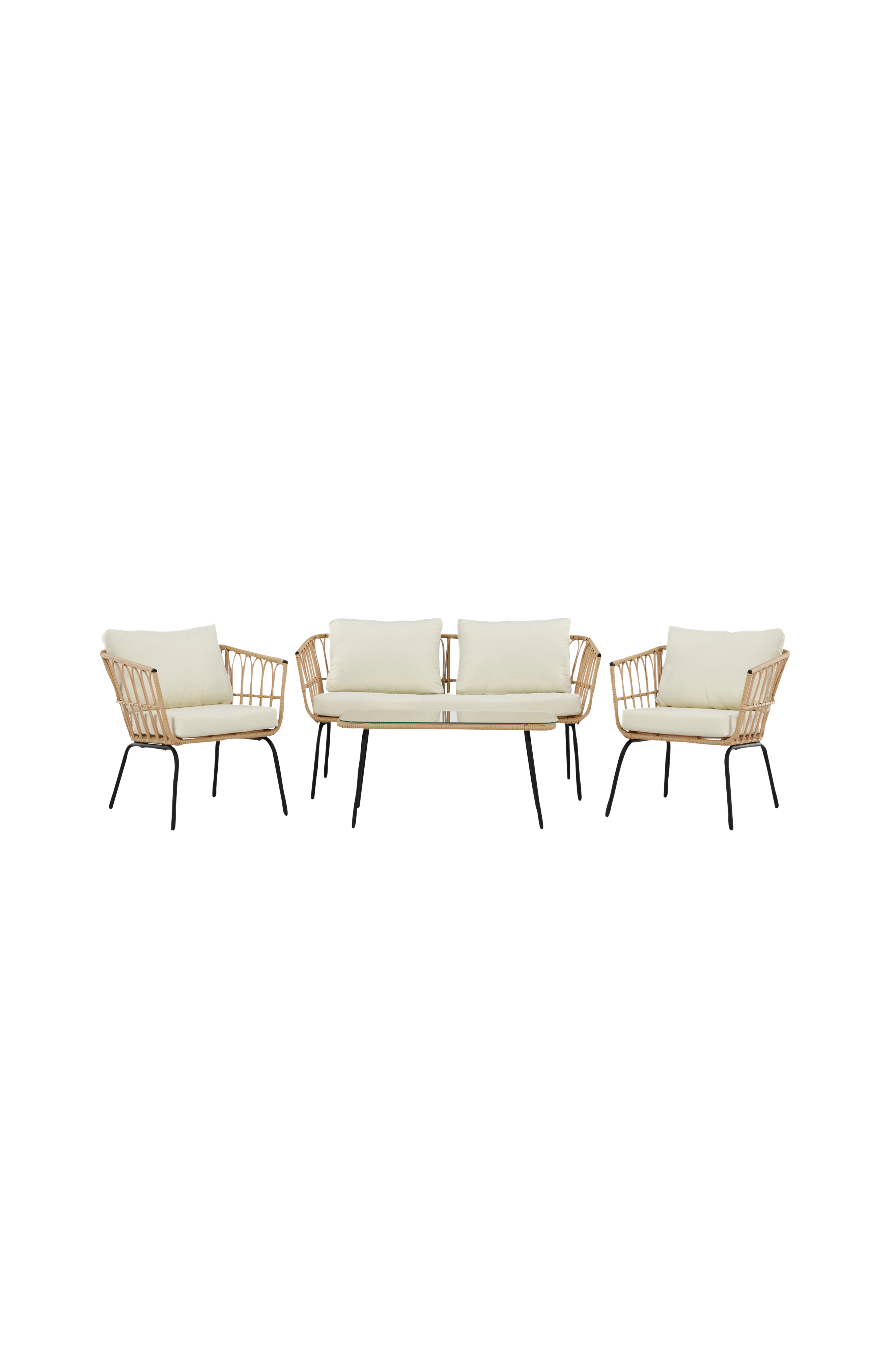 tyynyt on verhoiltu beigellä polyesterillä, joka on paitsi mukava myös kestävä ja helppo huoltaa. Istuimet on muotoiltu trendikkäästä rottingista, mikä antaa luonnollisen ja hienostuneen lisän. Lasinen pöytälevy täydentää muotoilua ja tarjoaa käytännöllisen pinnan kahville, kirjoille tai koristeille.