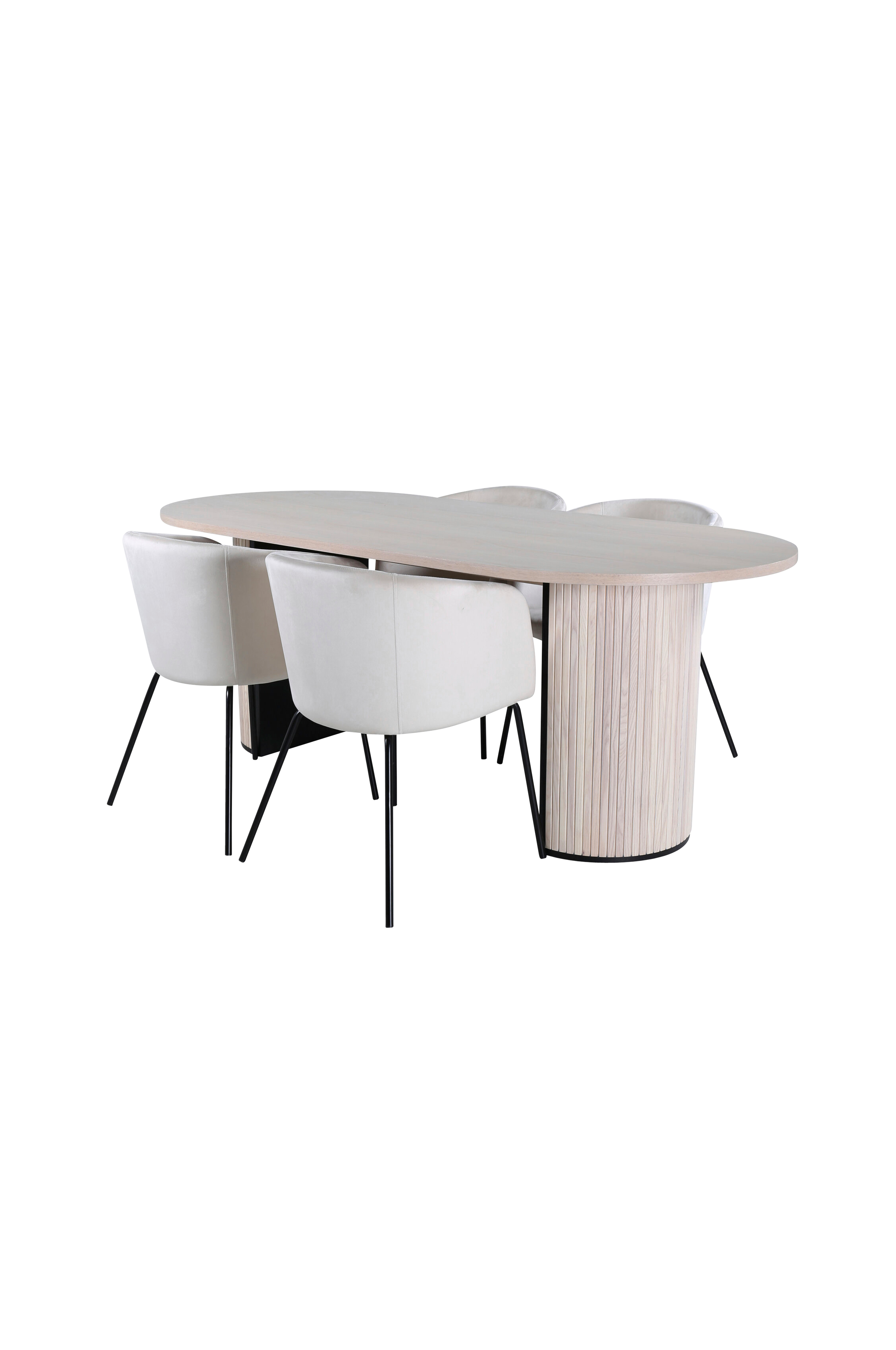Bianca-ruokapöytä, jossa soikea pöytälevy MDF-levyä ja vaneria. Jalat puuta ja MDF-levyä. Neljä Berit-tuolia, joissa istuin samettia ja jalat rautaa. Pöytä ja tuolit on helppo koota. Pöydän mitat: Pituus: 200 cm, leveys: 90 cm, korkeus: 75 cm. Tuolin mitat: Istuinsyvyys: 45 cm, istuinleveys: 55 cm, istuinkorkeus: 49 cm.