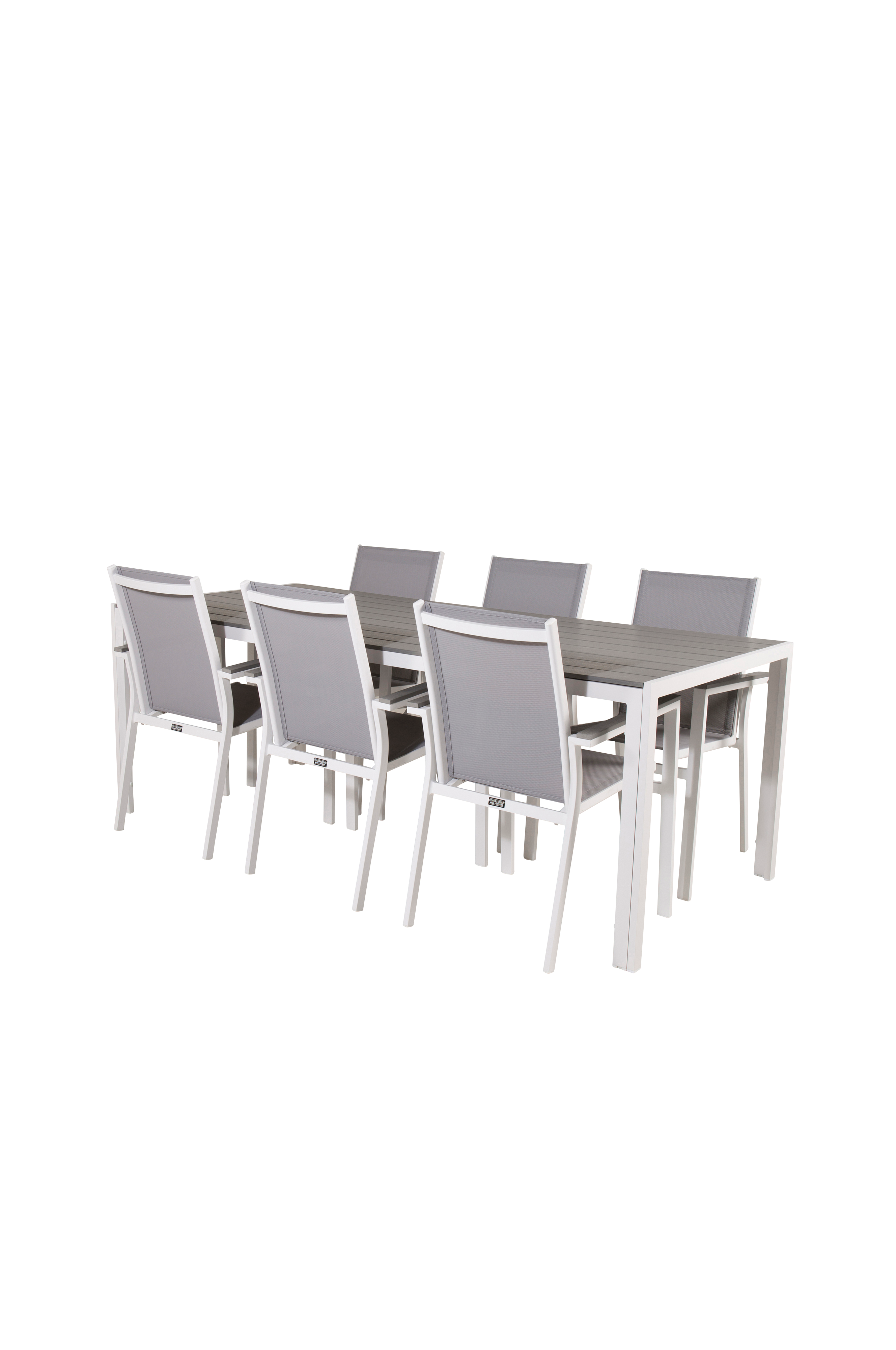 Bliss-ruokapöytä, jossa pöytälevy harmaata aintwood-materiaalia ja valkoiset alumiinijalat. Pöydän mitat: Pituus: 205 cm, leveys: 90 cm, korkeus: 74 cm. 6 pinottavaa Pascal-tuolia, joissa harmaa Textilene-kangas, harmaat yksityiskohdat aintwood-materiaalia ja valkoiset alumiinijalat. Tuolin mitat: Kokonaiskorkeus: 60 cm, leveys: 47 cm, syvyys: 42 cm, istuinkorkeus: 43,5 cm. Pöytä ja tuolit on helppo koota.