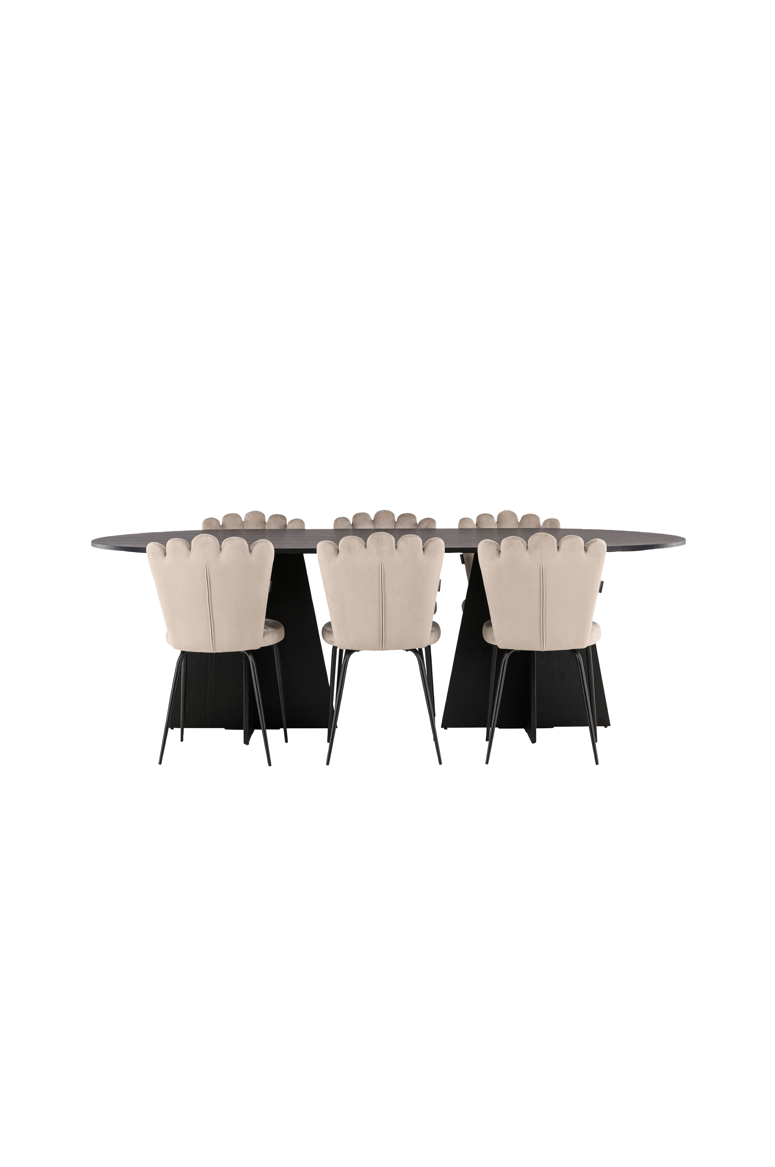 Lämmintä ja kutsuvaa tunnetta huokuva ruokailuryhmä! Soikeassa Bootcut-ruokapöydässä on ainutlaatuinen muotoilu - soikea pöytälevy MDF-levyä ja vaneria ja omaperäinen runko, jossa kaksi kartion muotoista, muotoilultaan avointa jalkaa. Tässä modernissa kokonaisuudessa pöytään on yhdistetty Limhamn-sarjan ruokapöydän tuolit. Tuolissa on kutsuva muotoilu, koristeellinen simpukankuoren muotoinen selkänoja koristesaumoin sekä tyylikkäällä sametilla verhoiltu pyöreä istuinosa. Jalat jauhemaalattua metallia. Istu mukavasti modernissa ruokailuryhmässä! Pöydän mitat: 230x115 cm.