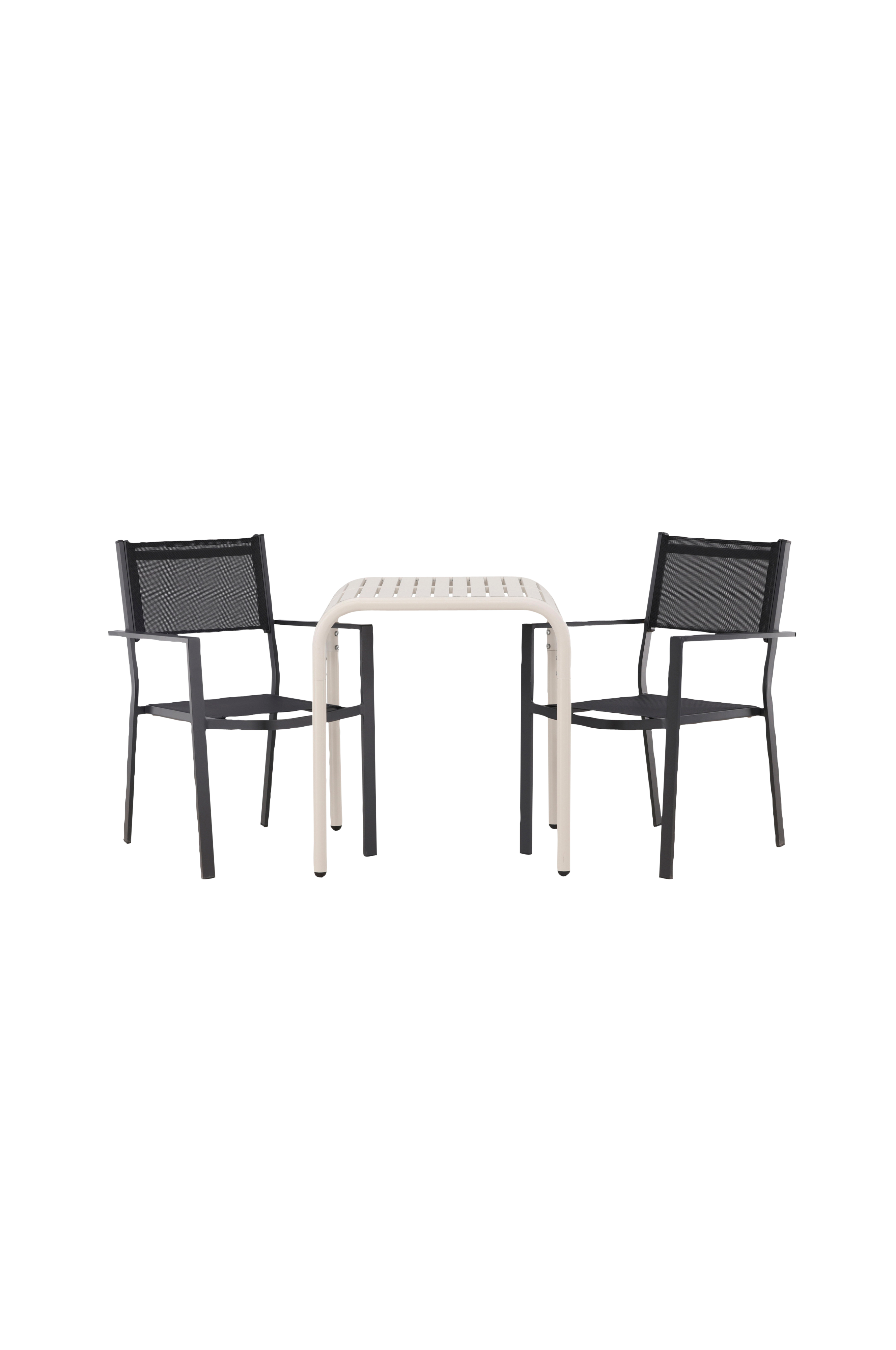 Täydellinen kahvilaryhmä pienelle parvekkeelle tai ulkotilaan! Borneo-sarjan pöydässä on taipuisat muodot ja ajaton skandinaavinen design. Pöytälevy koostuu rimoista, jotka taipuvat päädyissä jalkoja kohti. Pöytä on alumiinia, mikä tekee siitä kulutusta kestävän ja helpon siirtää paikasta toiseen. Tässä tyylikkäässä kokonaisuudessa on kaksi Copacabana-sarjan ruokapöydän tuolia. Pinottavissa tuoleissa on suorat pohjoismaiset muodot. Istuin Textilene-kangasta ja tuolin jalat alumiinia. Kata välipala kesällä ulos ja nauti mukavista hetkistä!