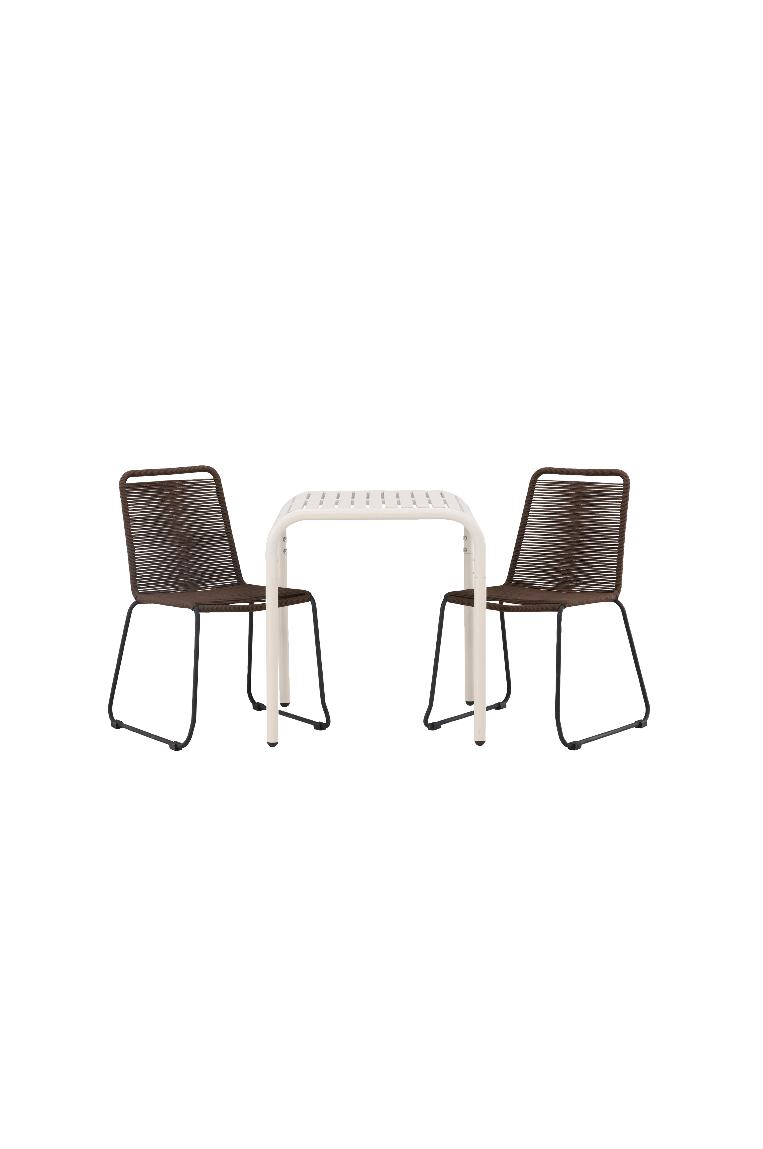 Viehättävä ruokailuryhmä, jossa on maanläheiset sävyt! Borneo-sarjan kahvilapöydässä on pehmeät muodot ja ajaton skandinaavinen design. Pöytälevy koostuu rimoista, jotka taipuvat päädyissä jalkoja kohti. Pöytä on alumiinia, mikä tekee siitä kulutusta kestävän ja helpon siirtää paikasta toiseen. Tässä pöytään on yhdistetty 2 Lindos-sarjan ruokapöydän tuolia. Tuoleissa on kulutusta kestävä värillinen naruistuinosa, ja ne sopivat erinomaisesti ulkokäyttöön. Kata kahvit kesällä pienelle parvekkeelle tai ulkotilaan!