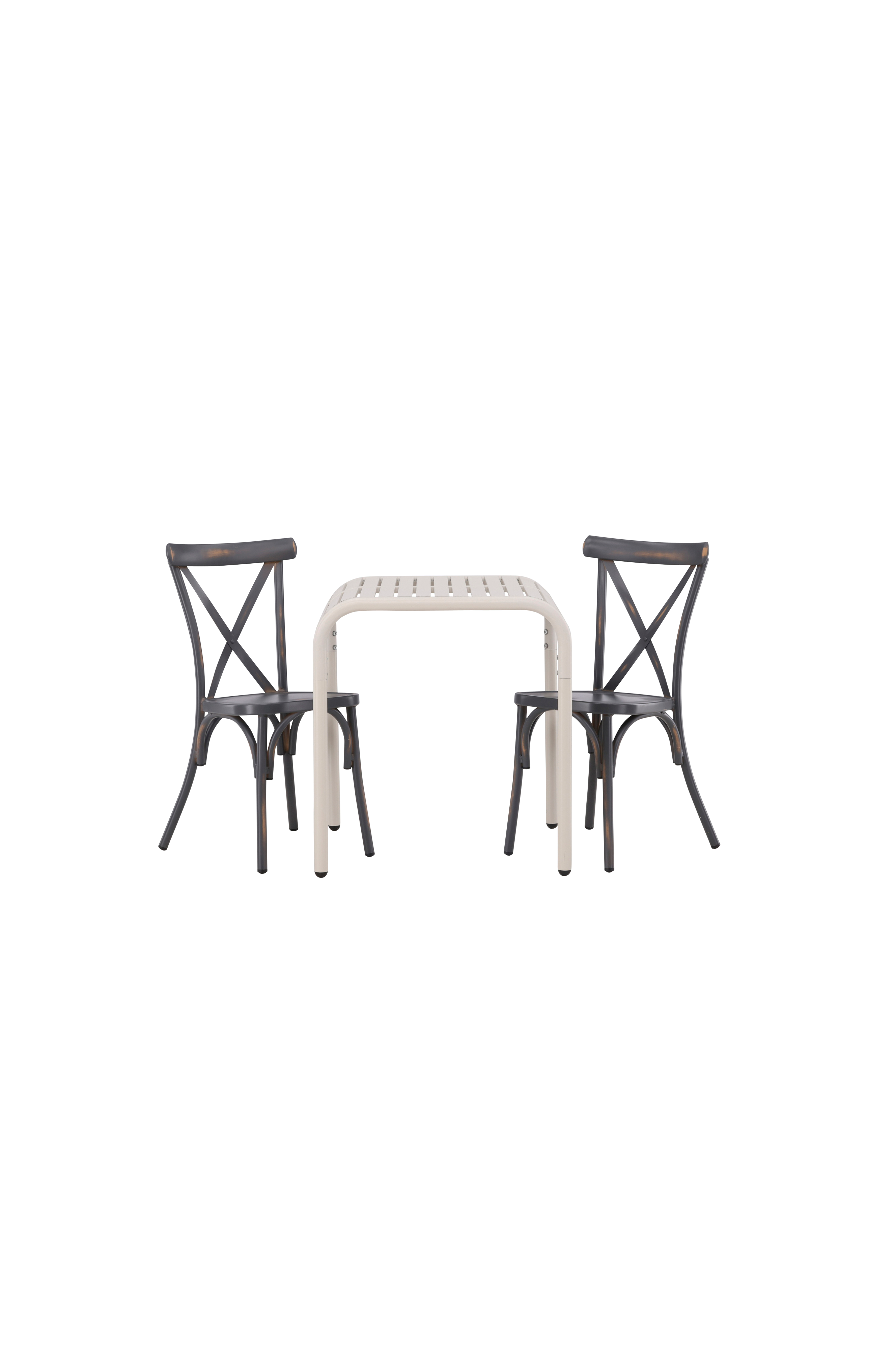 Täydellinen kahvilaryhmä ulkotilaasi! Borneo-sarjan kahvilapöydässä on pehmeät muodot ja ajaton skandinaavinen design. Pöytälevy koostuu rimoista, jotka taipuvat päädyissä jalkoja kohti. Pöytä on alumiinia, mikä tekee siitä kulutusta kestävän ja helpon siirtää paikasta toiseen. Tässä ryhmässä pöytään on yhdistetty 2 Tablas-sarjan ruokapöydän tuolia. Tuolissa on ristikko selkänojassa ja hieman levenevät jalat, jotka antavat vakaan vaikutelman. Tuolit ovat kauttaaltaan noenmustaa alumiinia. Kata kahvit kesällä ulos ja nauti vapaa-ajasta yhdessä muiden kanssa!
