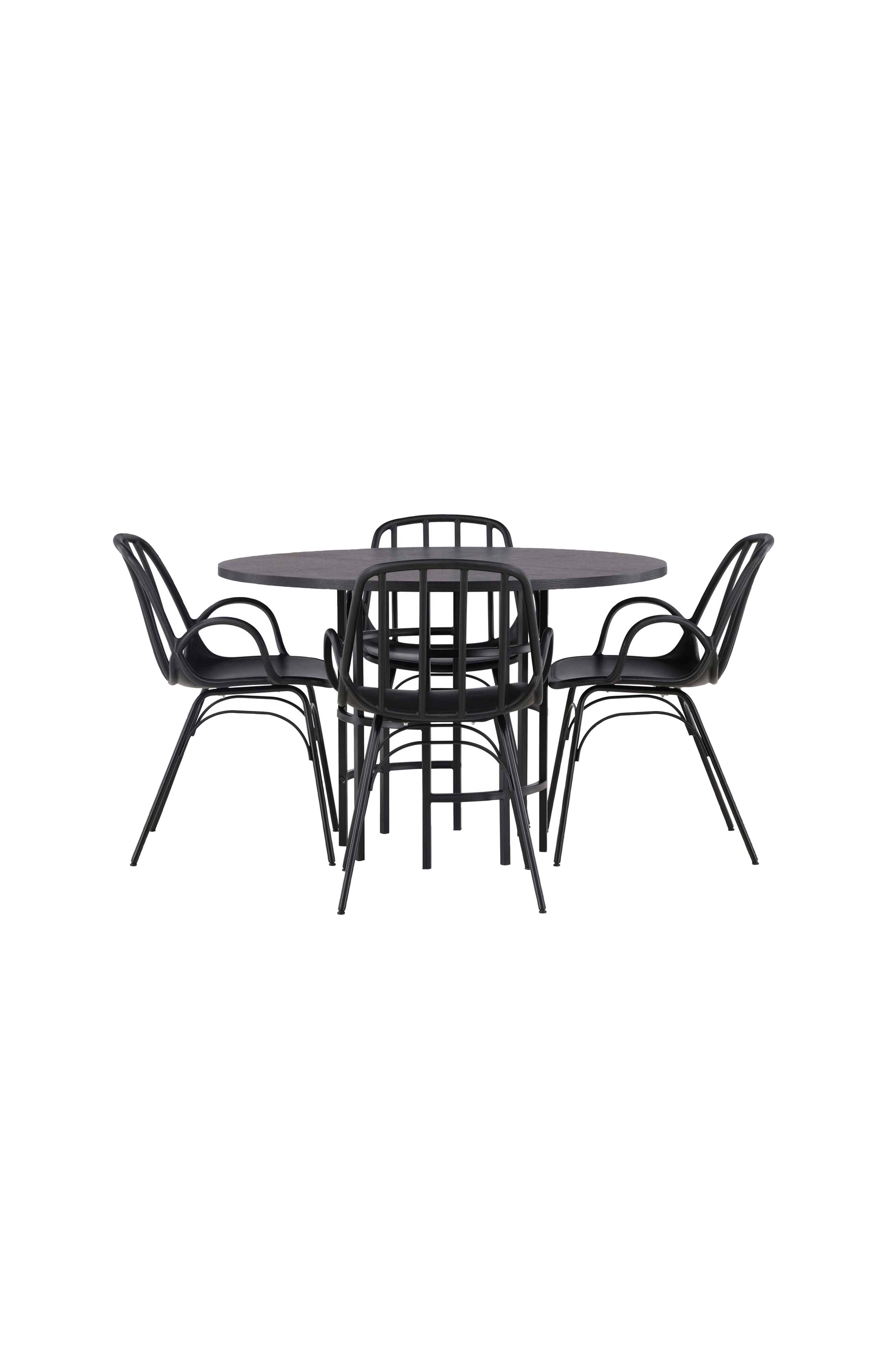 Tämä ruokailuryhmä sopii sekä keittiöön että tyyliltään juhlavaan olohuoneeseen! Pyöreässä Copenhagen-ruokapöydässä on elegantti MDF-pöytälevy ja koristeellinen sylinterinmuotoinen metallijalusta. Tässä kokonaisuudessa on Dyrön-sarjan huolella suunnitellut ruokapöydän tuolit. Tyylikkäät ja käytännölliset tuolit ovat muovia ja terästä. Istuimessa on kiinteät käsinojat ja hieman pyöristetyssä selkänojassa rimamainen muotoilu. Muotoilultaan skandinaaviset, tyylikkään kapeat ja kevyesti ulospäin levenevät jalat. Istu trendikkäästi vuodesta toiseen!