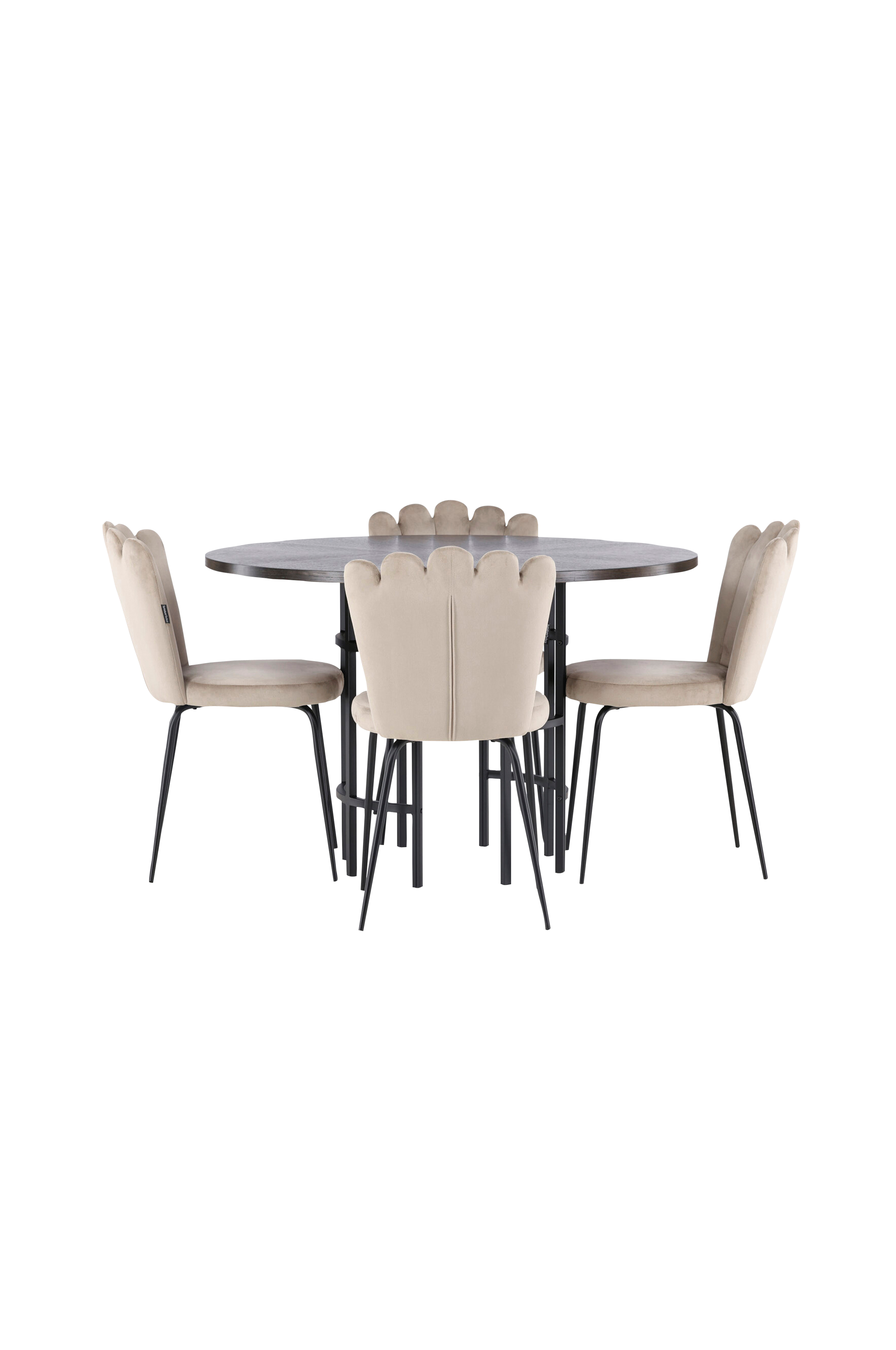 Näyttävää ja tyylikästä! Pyöreä Copenhagen-ruokapöytä, jossa kaunis ruskea pöytälevy MDF-levyä ja vaneria, ja koristeellinen sylinterinmuotoinen metallijalusta. Tässä modernissa kokonaisuudessa pöytään on yhdistetty Limhamn-sarjan ruokapöydän tuolit. Kutsuva muotoilu, koristeellinen simpukankuoren muotoinen selkänoja koristesaumoin, pyöreä istuin ja tyylikäs samettiverhoilu. Jalat jauhemaalattua metallia. Tuoleissa on ylellistä istua! Pöydän mitat: 115 cm.