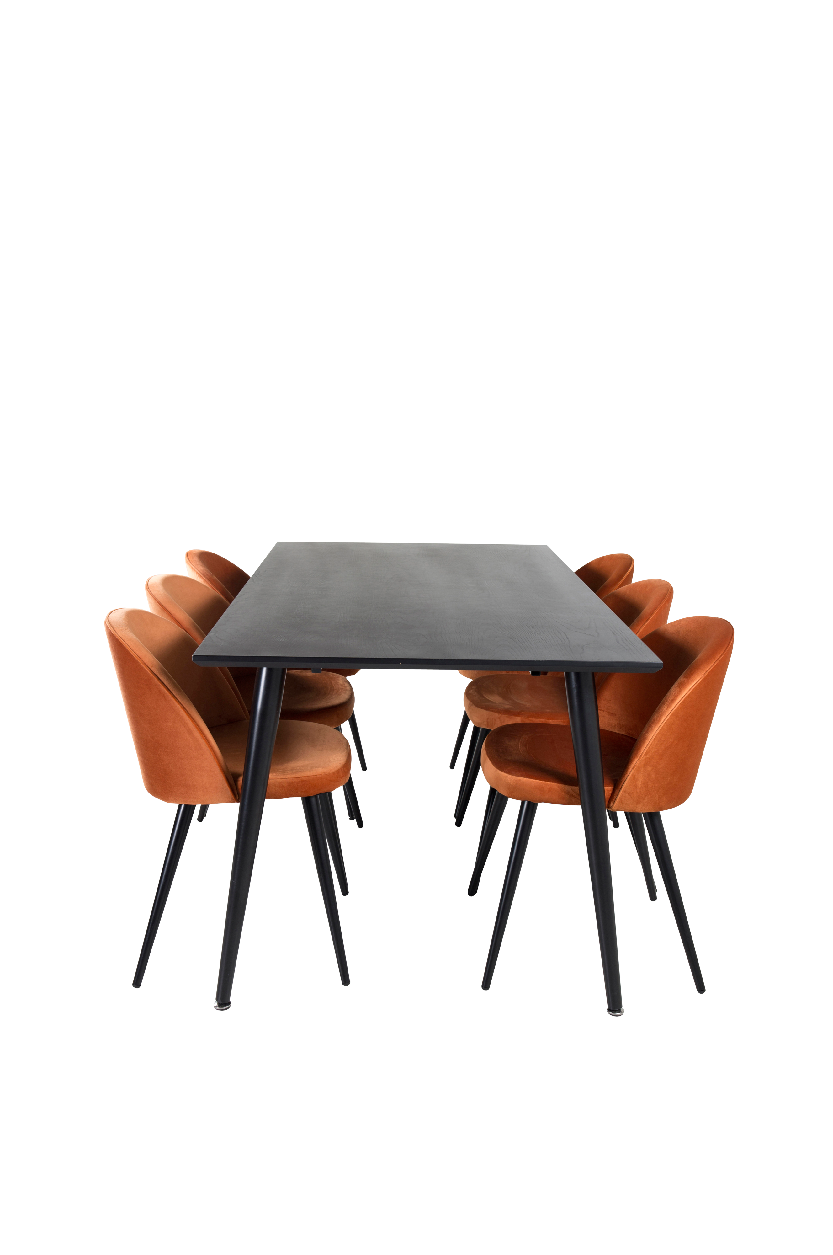Dipp-ruokapöytä, jossa MDF-pöytälevy ja metallijalat. Kuusi Velvet-tuolia, joissa istuin samettia ja jalat metallia. Pöytä ja tuolit on helppo koota. Pöydän mitat: Pituus: 180 cm, leveys: 90 cm, korkeus: 75 cm. Tuolin mitat: Istuinleveys: 41 cm, istuinsyvyys: 42,5 cm, istuinkorkeus: 46,5 cm.