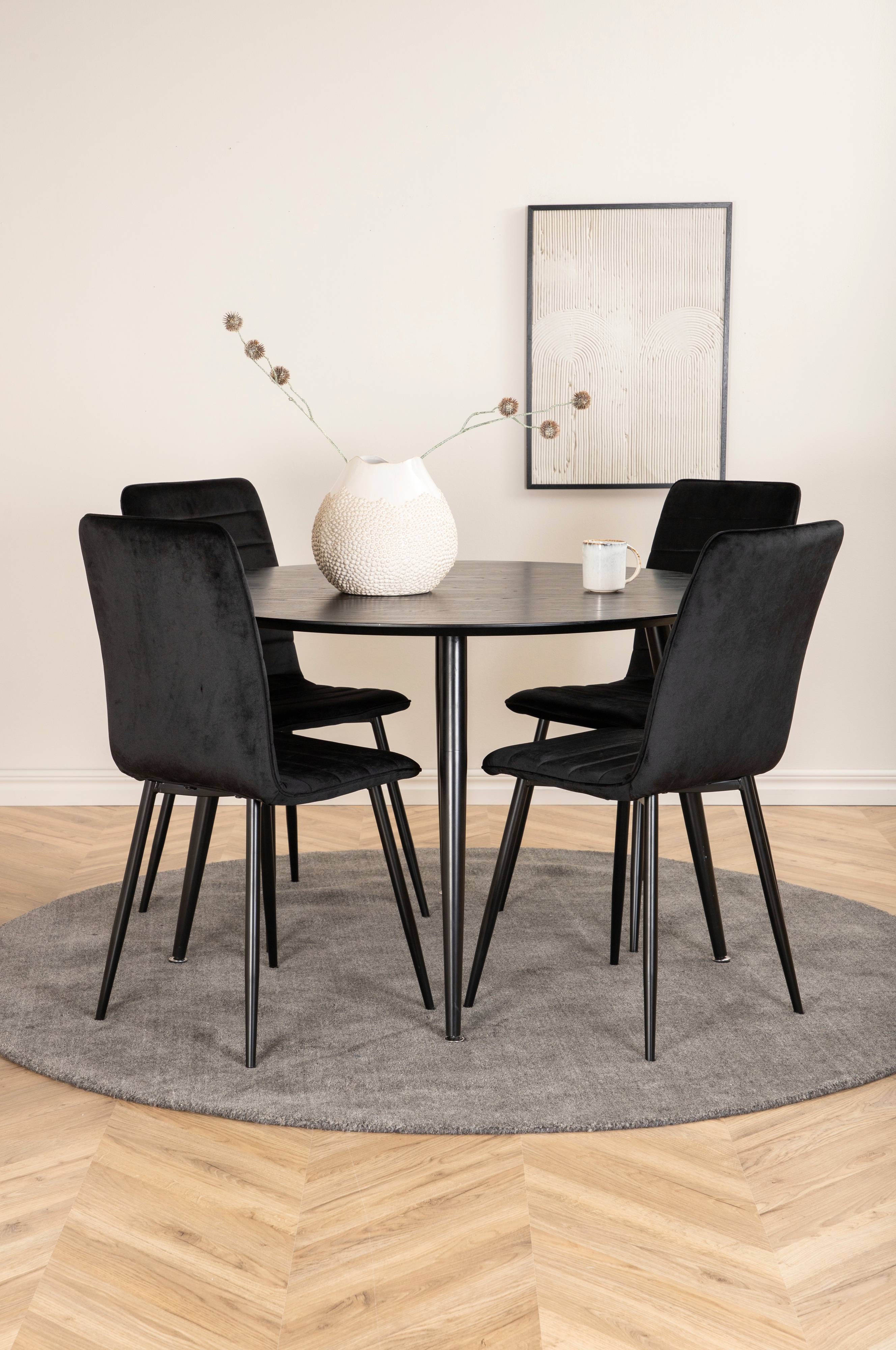 Dipp-ruokapöytä, jossa pyöreä MDF-pöytälevy ja metallijalat. Neljä Windu Lyx -tuolia, jalat metallia. Pöytä ja tuolit on helppo koota. Pöydän mitat: Halkaisija: 115 cm, korkeus: 75 cm. Tuolin mitat: Istuinsyvyys: 37 cm, istuinleveys: 41 cm, istuinkorkeus: 47 cm.