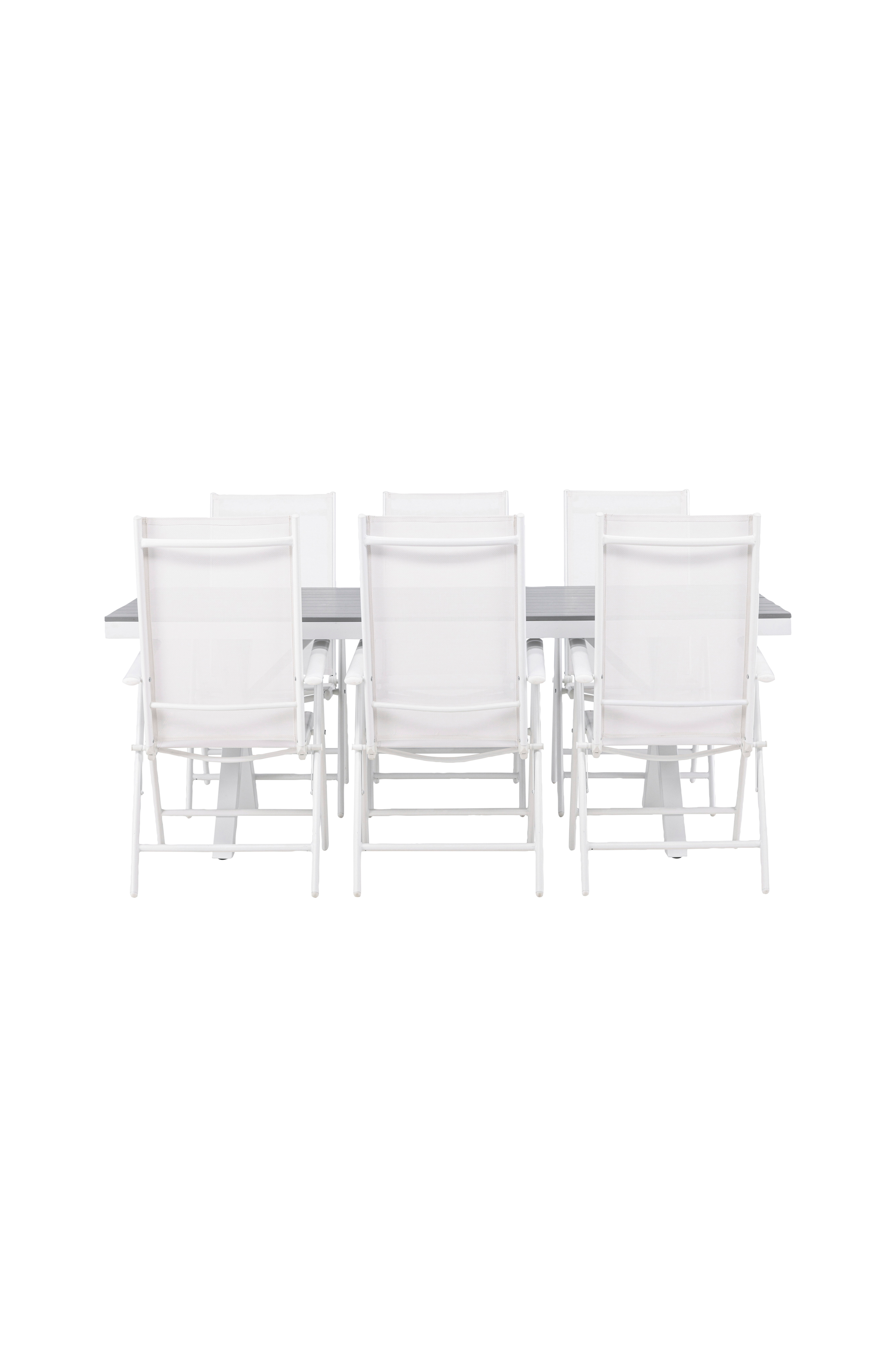 Luo valoisa ja raikas katseenvangitsija terassille! Suorakulmaisessa Garcia-ruokapöydässä on klassinen design. Pöytälevy on tyylikästä aintwood-materiaalia ja ristikkäiset jalat alumiinia. Tässä ryhmässä on saman sarjan taitettavat ruokapöydän tuolit: Break. Tuolin istuin Textilene-kangasta ja alumiinijalat. Taitettava tuoli on kätevä ja erittäin mukava. Valmistaudu ihanaan kesään ja pihaelämään!