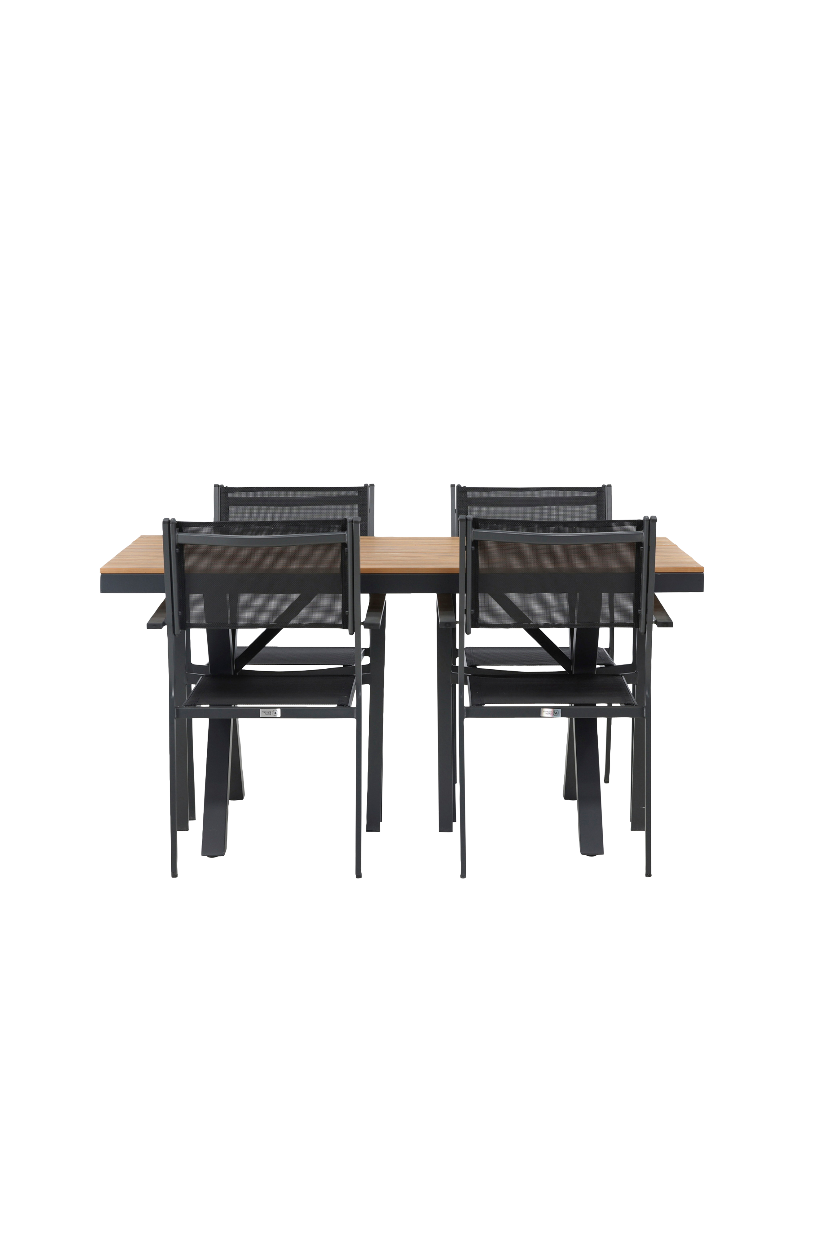 Kata illallinen ulos kesällä! Suorakulmaisessa Garcia-ruokapöydässä on klassinen design. Pöytälevy on kaunista aintwood-materiaalia ja ristikkäiset jalat alumiinia. Tässä tyylikkäässä kokonaisuudessa on neljä Copacabana-sarjan mukavaa ruokapöydän tuolia. Alumiinituoleissa on suora pohjoismainen design ja istuin Textilene-kangasta. Kalusta ulkotila kutsuvaksi ja trendikkääksi!