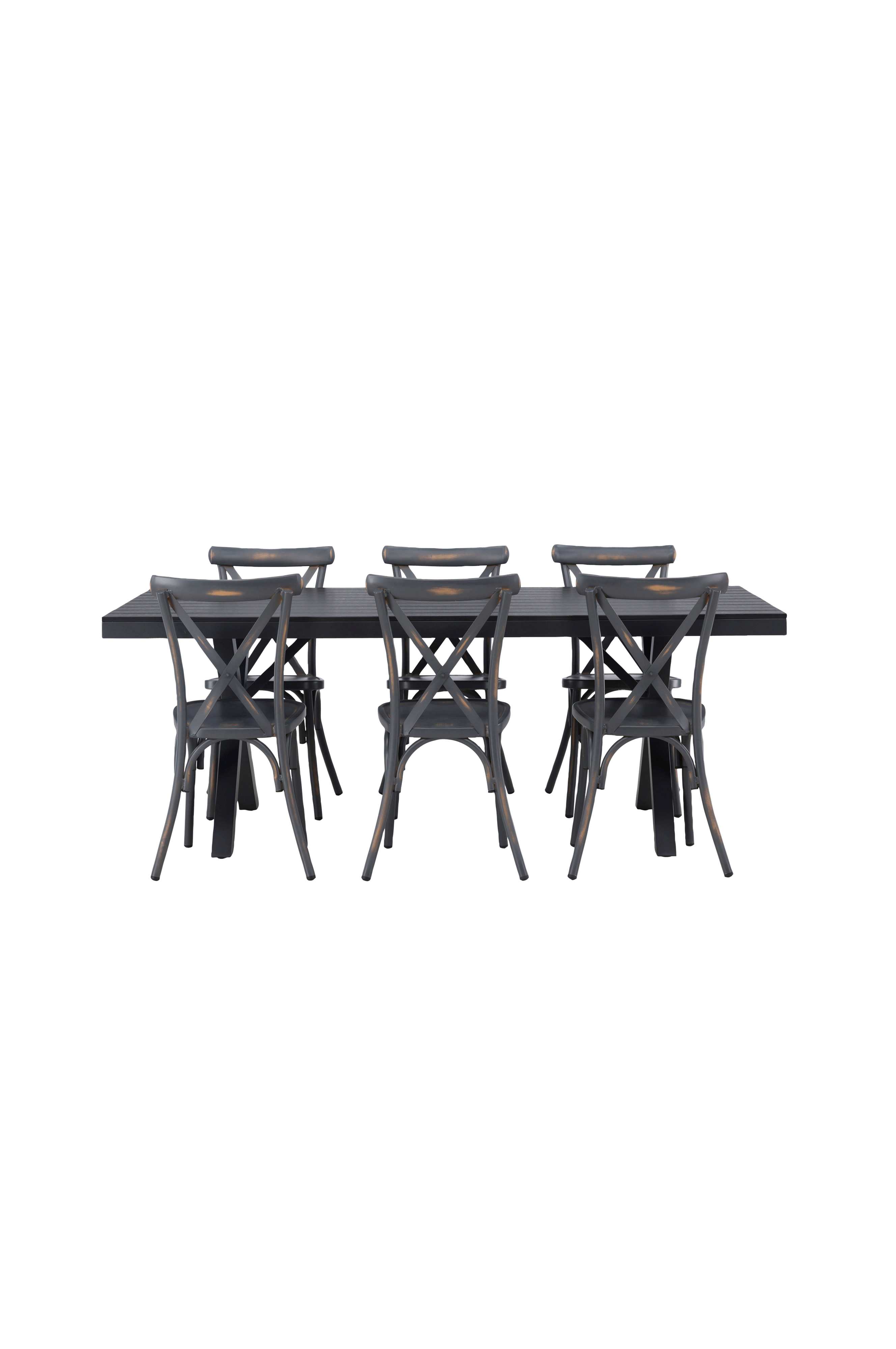 Näyttävä ruokailuryhmä, jossa skandinaavinen design - ryhmä sopii täydellisesti ulkotilaan! Suorakulmaisessa Garcia-ruokapöydässä on klassinen design. Pöytälevy on aintwood-materiaalia ja ristikkäiset jalat alumiinia. Tässä yhteensopivassa kokonaisuudessa on Tablas-sarjan modernit ruokapöydän tuolit. Teollishenkinen tuoli on valmistettu kestävästä noenvärisestä alumiinista. Hanki näyttävä katseenvangitsija ja istu mukavasti tänä kesänä!