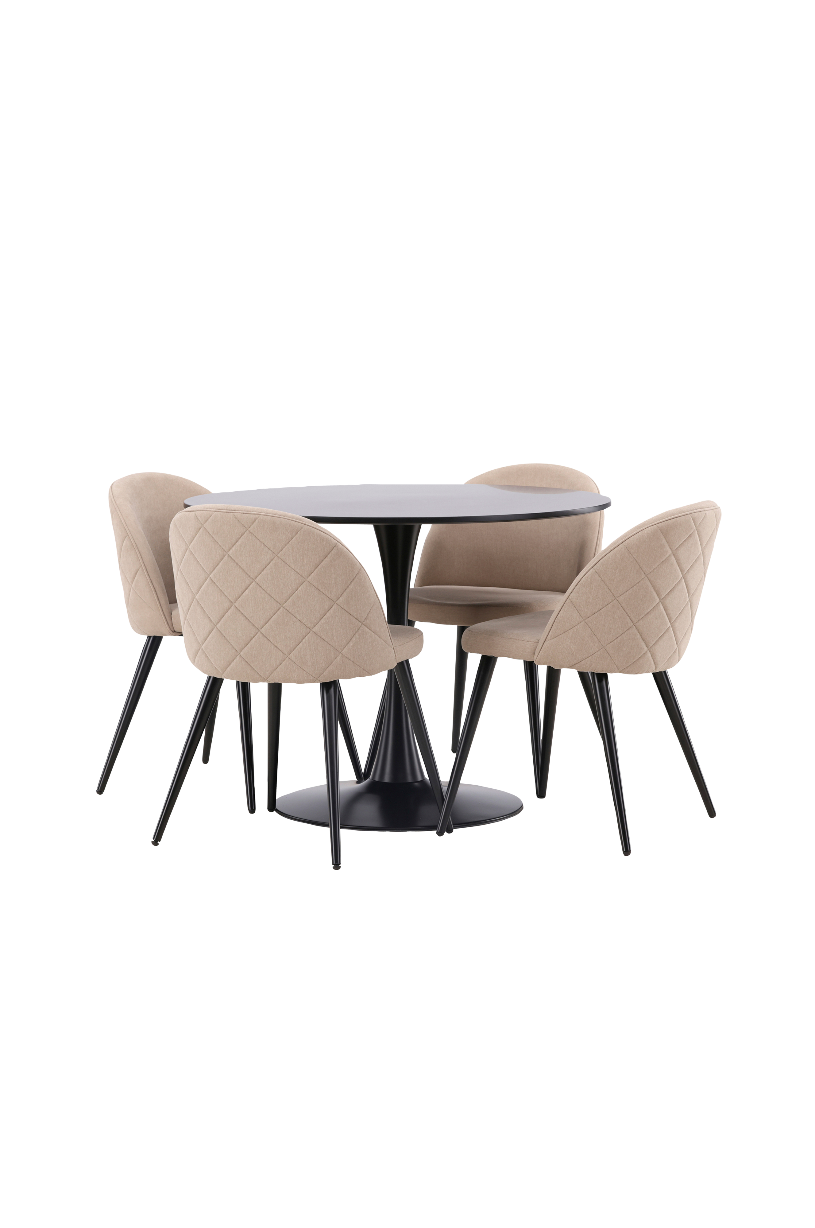 Yksityiskohdat luovat kokonaisuuden! Glade-ruokapöytä, jossa tyylikäs skandinaavinen muotoilu. Kapealinjainen trumpettijalka terästä ja pöytälevy MDF-levyä. Tässä tyylikkäässä kokonaisuudessa on Velvet Stitches -sarjan ruokapöydän tuolit. Tuolin selkänoja on pyöristetty ja pehmeästi pehmustettu, kuten istuinkin. Verhoiltu sametilla ja polyesteripellavalla koristesaumoin, takana ruutukuvio. Hieman levenevät rautajalat luovat vakaan vaikutelman. Yhtä moderni kuin mukavakin! Pöydän mitat: 100 cm.
