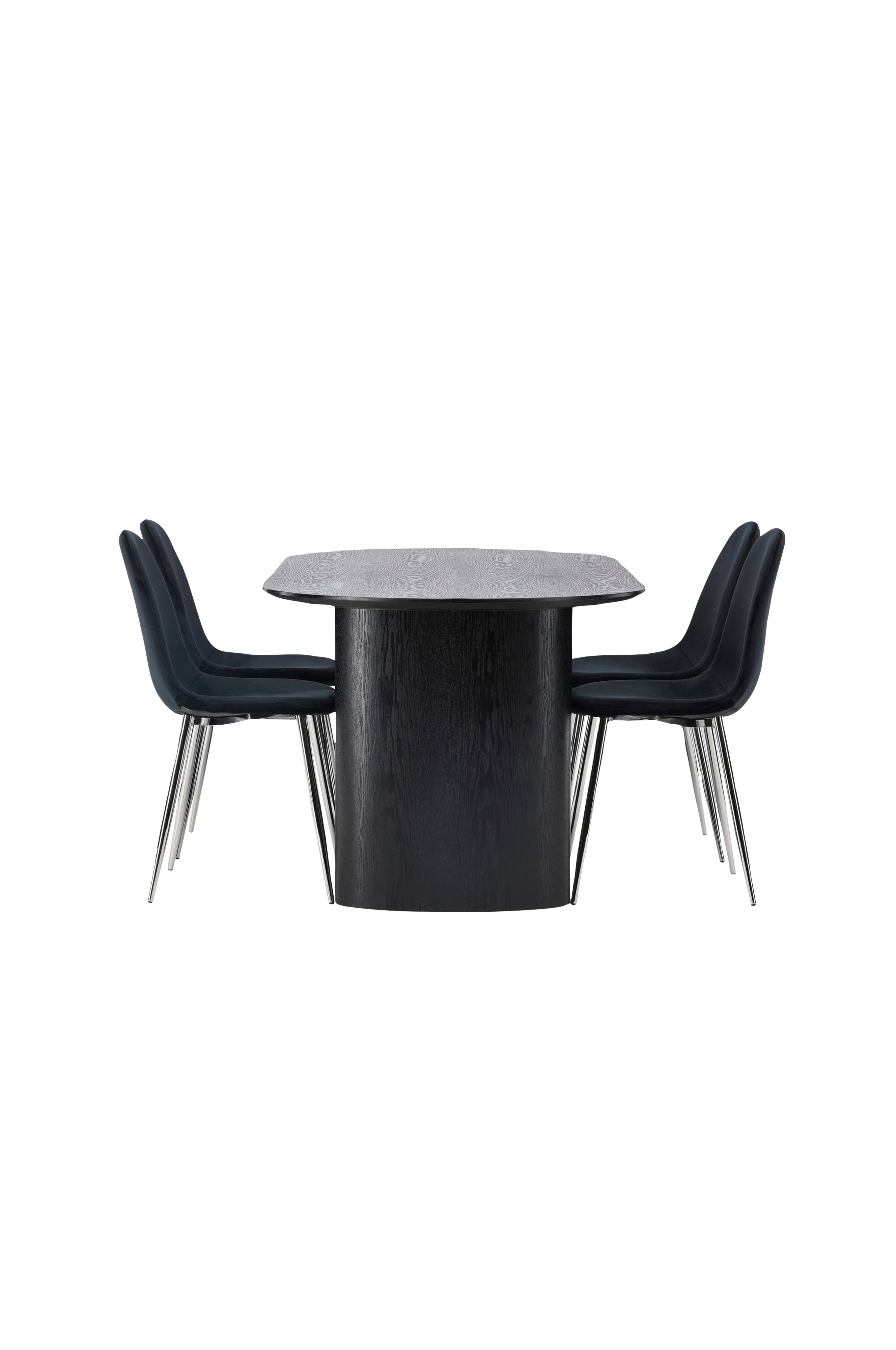 Luo näyttävä tyyli olohuoneeseen! Tyylikkään värisessä soikeassa Isolde-ruokapöydässä on moderni muotoilu, soikea pöytälevy MDF-levyä ja tukeva runko, joka antaa vankan vaikutelman. Eläväpintainen materiaali luo tyylikästä liikettä katseenvangitsijaan. Tässä modernissa kokonaisuudessa on Polar-sarjan ruokapöydän tuolit. Verhoillussa tuolissa on kromatut metallijalat, kevyesti pyöristetty ja kauniilla sametilla verhoiltu selkänoja ja istuinosa sekä mukavuutta parantava pehmustus. Voisiko olla parempaa?
