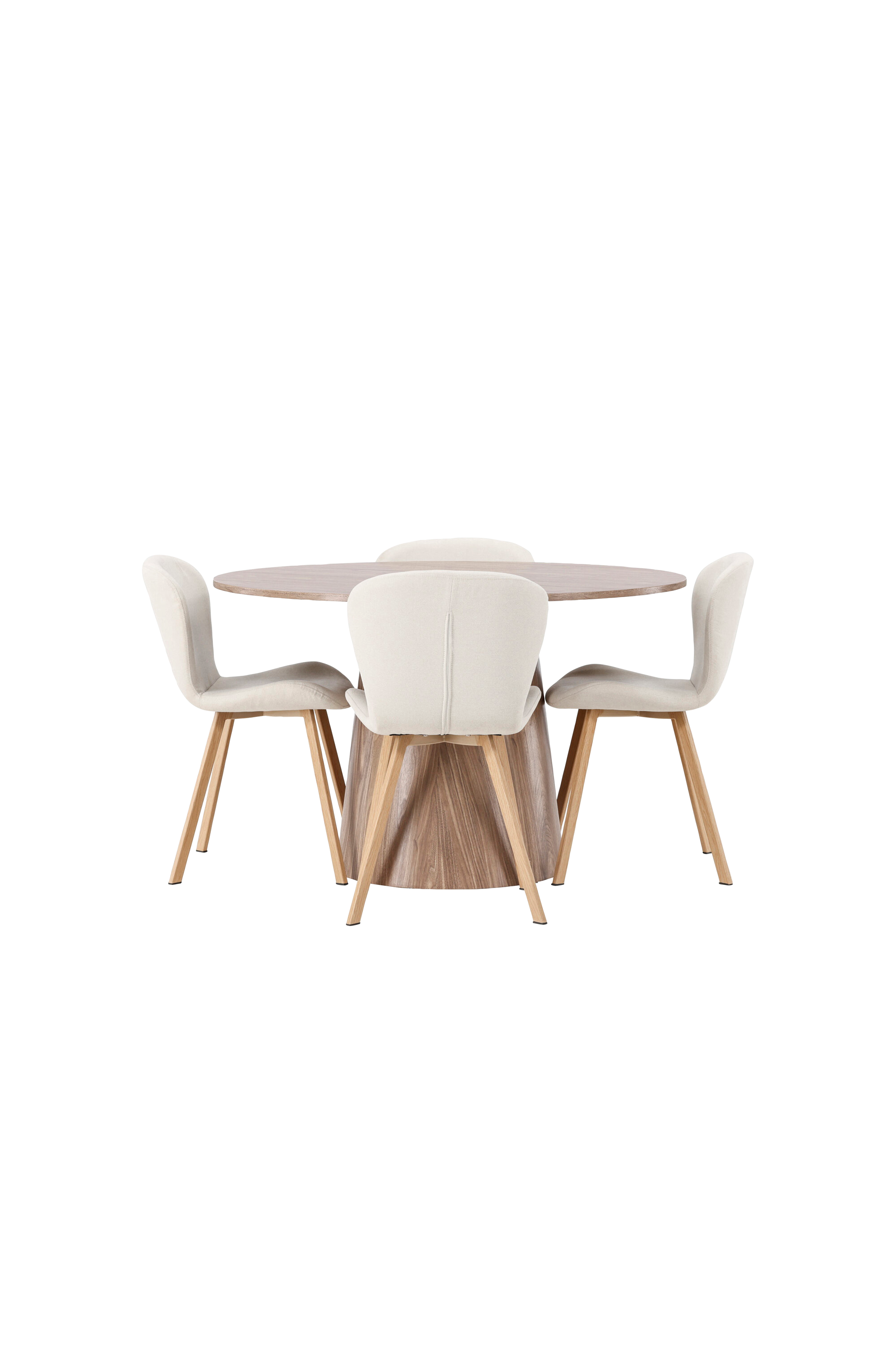 Viehättävä ja tyylikäs ruokailuryhmä! Venture Designin ihastuttava Lanzo-ruokapöytä on kauttaaltaan MDF-levyä. Siinä on ohut pöytälevy ja kierretty kartionmuotoinen runko keskellä pöytälevyn alla. Maanläheinen sävy jättää materiaalin kuvion näkyviin. Tässä upeassa kokonaisuudessa on Lilja-sarjan ruokapöydän tuolit. Tuolissa on myötäilevän pyöreä muotoilu, polyesterikankaalla verhoiltu istuinosa ja kevyesti ulospäin levenevät metallijalat. Sisusta olohuone fiksusti ja kutsuvasti!