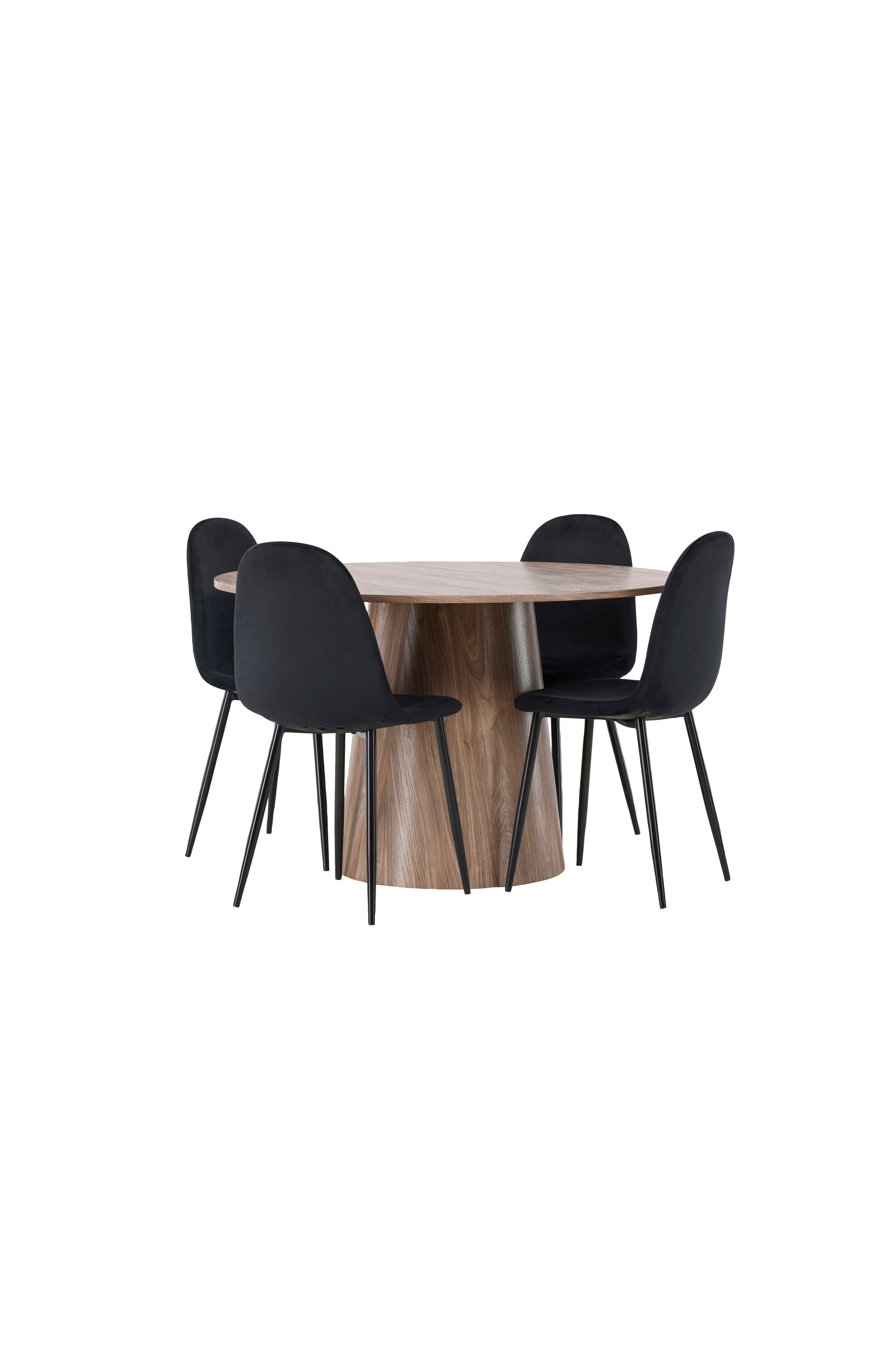 Puunvärisessä Lanzo-ruokapöydässä on näyttävä muotoilu ja pyöreä pöytälevy ohutta MDF-levyä. Pöydän alla keskelle sijoitettu sylinterinmuotoinen runko viimeistelee kokonaisuuden ja toimii upeana katseenvangitsijana huoneessa. Luonnonläheinen väri tuo myös materiaalien kuvion tyylikkäästi näkyviin. Puunväriseen Leo-ruokapöytään on yhdistetty Polar-tuolit. Nämä tuolit on muotoiltu huolellisesti, ja ne tarjoavat täydellisen tyylin ja mukavuuden tasapainon. Tuoleissa on kokoverhoilu ja istuinosa pehmeää samettikangasta, joka antaa ylellisen tunteen. Mustat jauhemaalatut metallijalat antavat modernin säväyksen ja varmistavat hyvän vakauden.