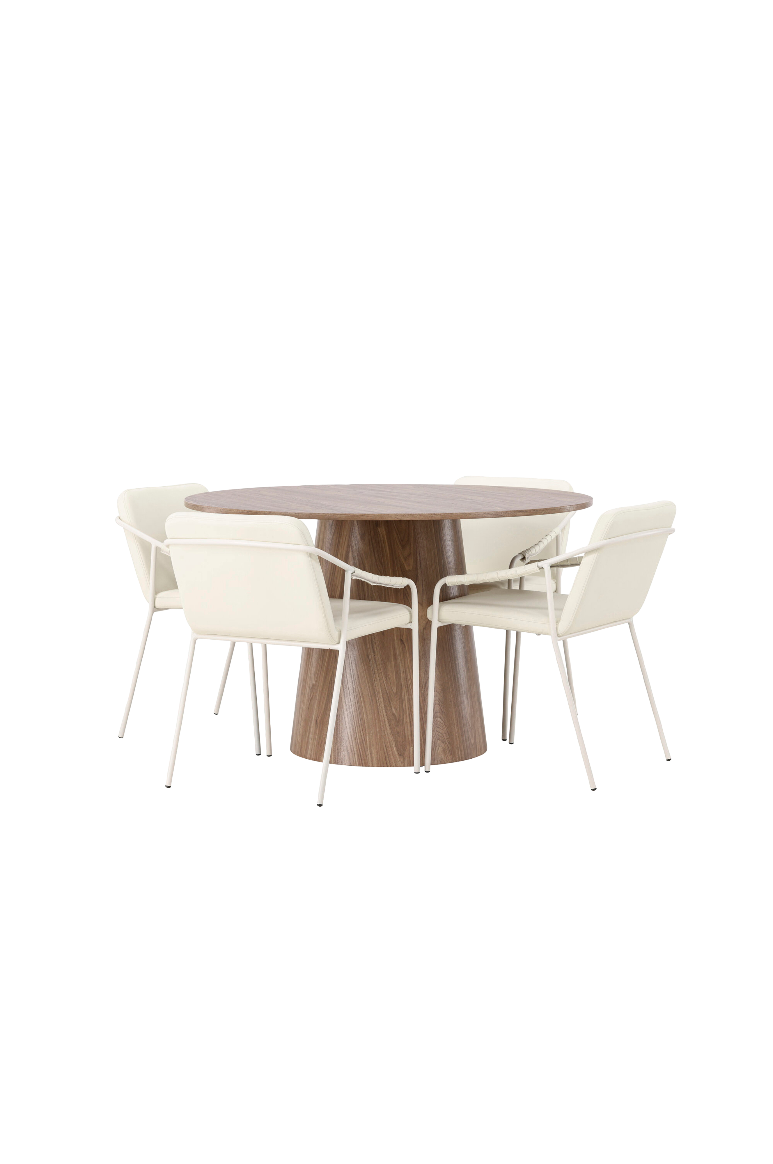 Tässä puunväriseen ruokapöytään on yhdistetty Tvist-sarjan ruokapöydän tuolit. Tuolissa on mukava istuinosa ja selkänoja on pehmeää polyuretaaninahkaa ja polyesteriä. Tyylikkäät tuolinjalat ovat valkoista rautaa ja antavat vakaan ja luotettavan perustan.
