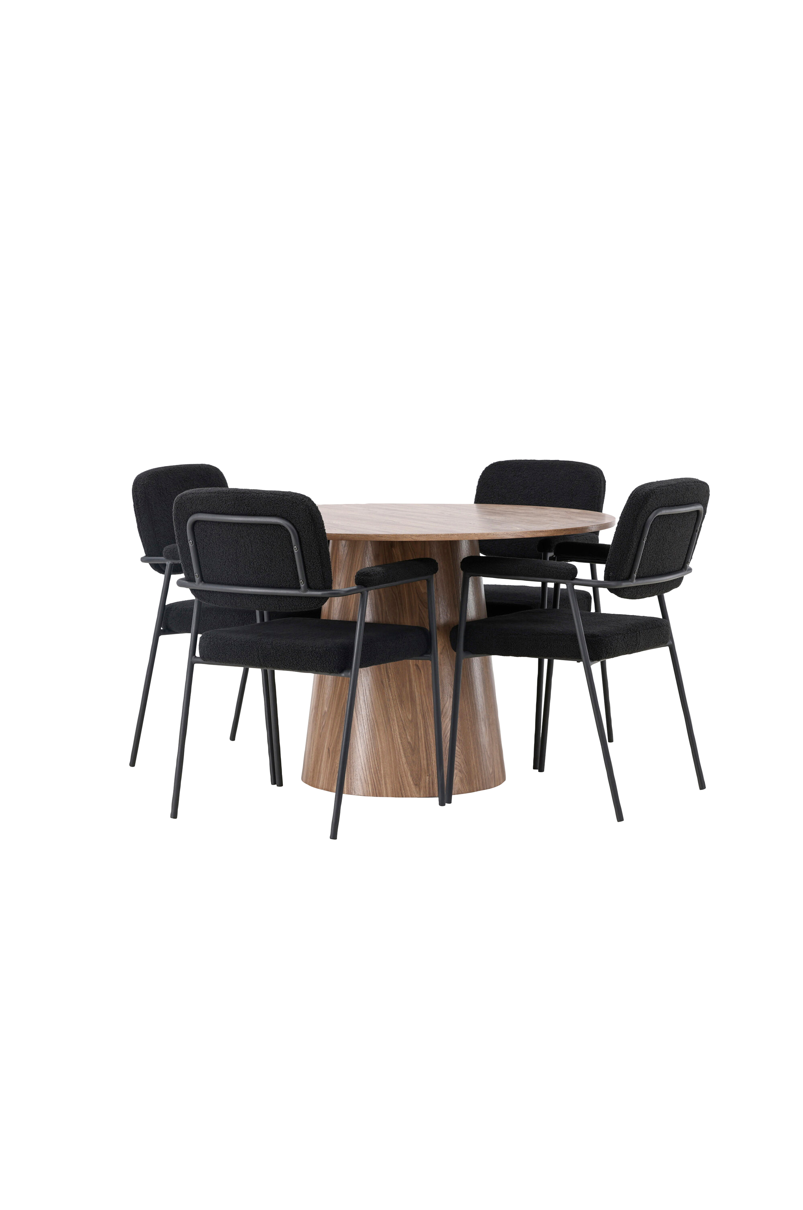 Puunvärinen Lanzo-ruokapöytä tekee vaikutuksen skandinaavisella designillaan ja tyylikkäällä muotoilullaan. Pöytä on kokonaan MDF-levyä. Siinä on pyöreä pöytälevy ja kierretty sylinterinmuotoinen runko, joka sijaitsee pöydän keskiosan alla. Maanläheinen väri korostaa materiaalin kaunista kuviota ja luo harmonisen tunnelman.