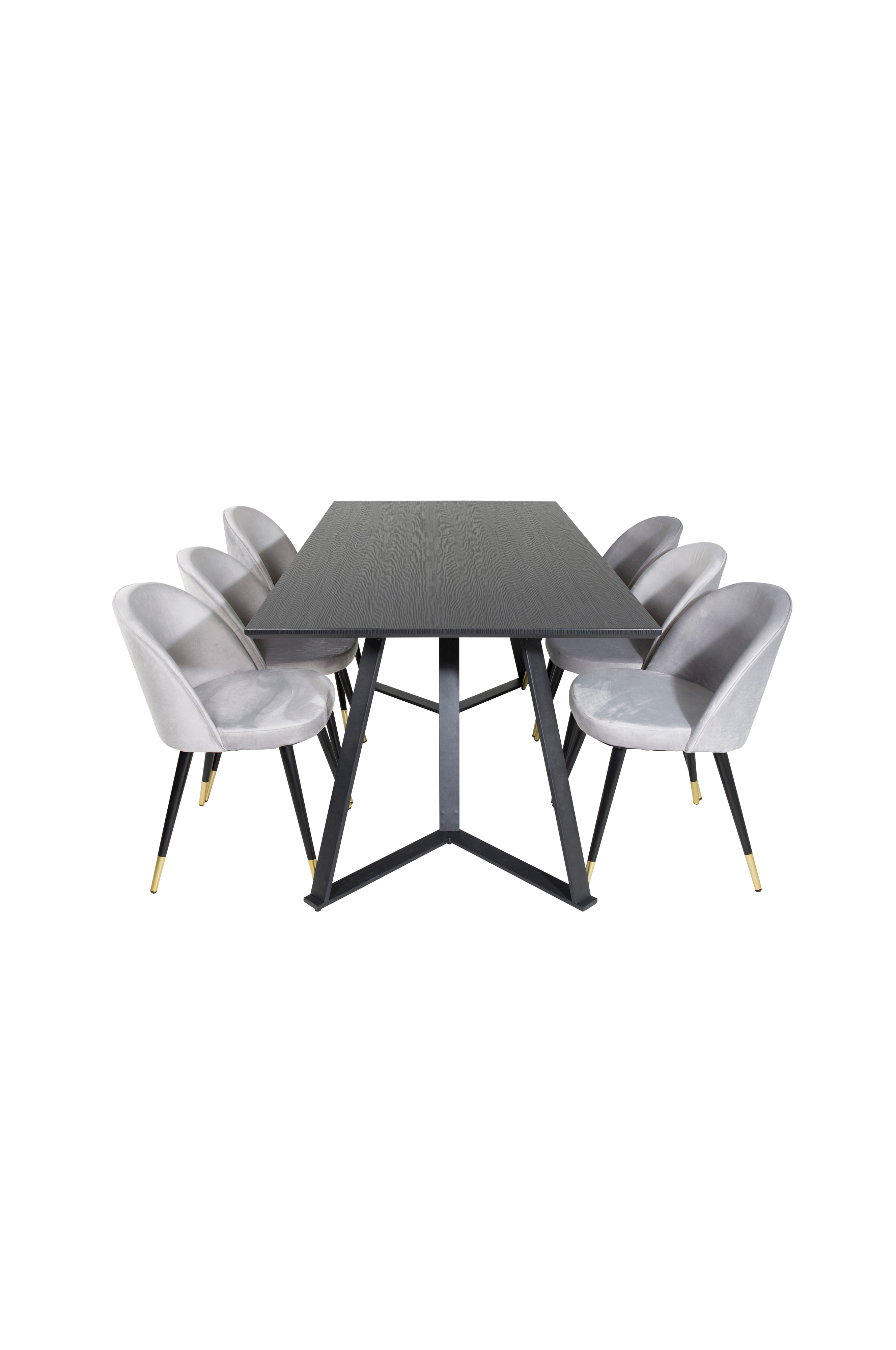 Maggie-ruokapöytä, jossa MDF-pöytälevy ja metallijalat. Kuusi Valleta-tuolia, joissa on istuin samettia. Metallijaloissa messinginväriset yksityiskohdat. Pöytä ja tuolit on helppo koota. Pöydän mitat: Pituus: 180 cm, leveys: 90 cm, korkeus: 75 cm. Tuolin mitat: Istuinsyvyys: 42,5 cm, istuinleveys: 41 cm, istuinkorkeus: 46,5 cm.