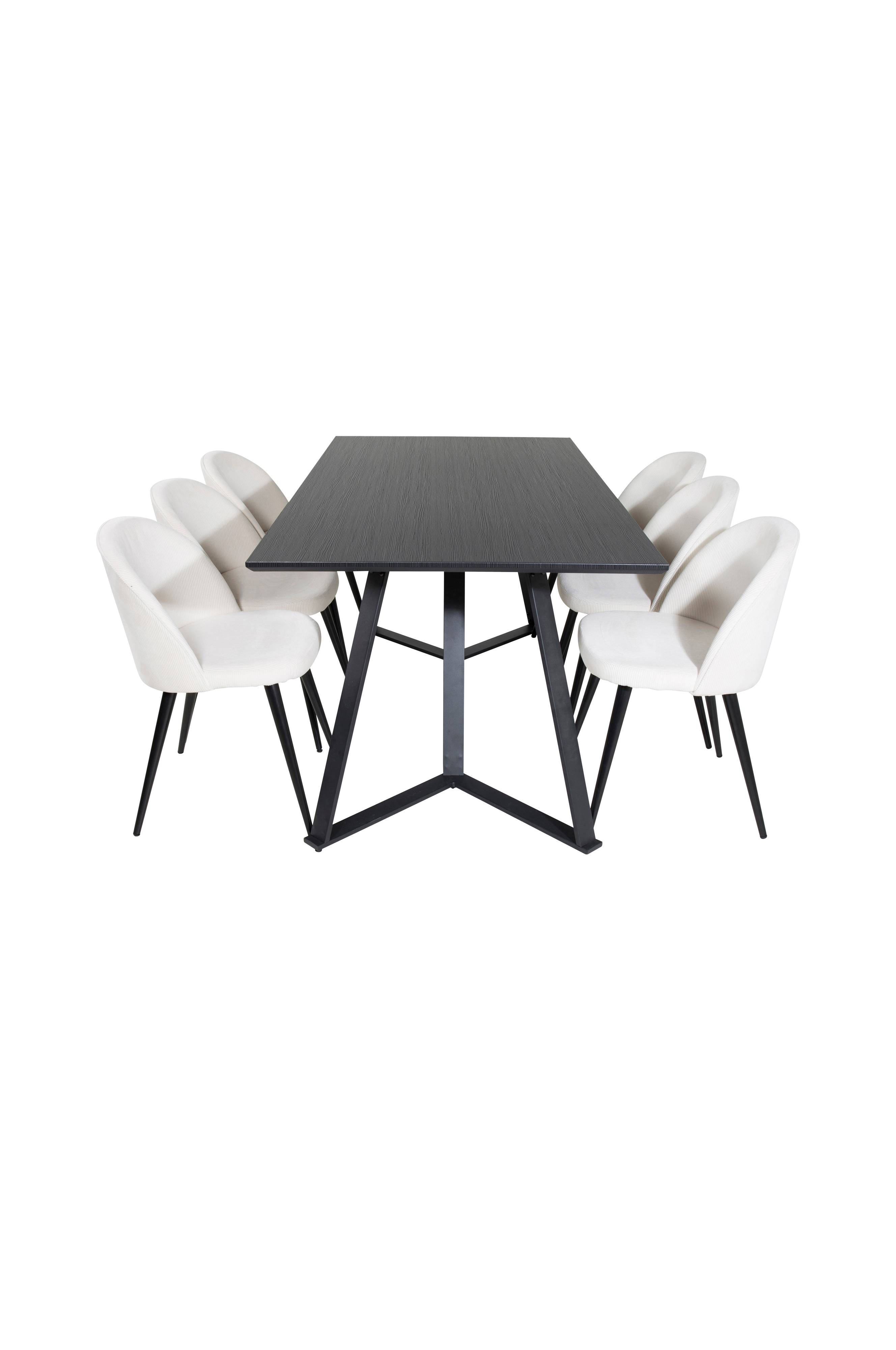 Maggie-ruokapöytä, jossa MDF-pöytälevy ja metallijalat. Kuusi Valleta-tuolia, joissa on istuin vakosamettia ja metallijalat. Pöytä ja tuolit on helppo koota. Pöydän mitat: Pituus: 180 cm, leveys: 90 cm, korkeus: 75 cm. Tuolin mitat: Istuinsyvyys: 42,5 cm, istuinleveys: 41 cm, istuinkorkeus: 46,5 cm.