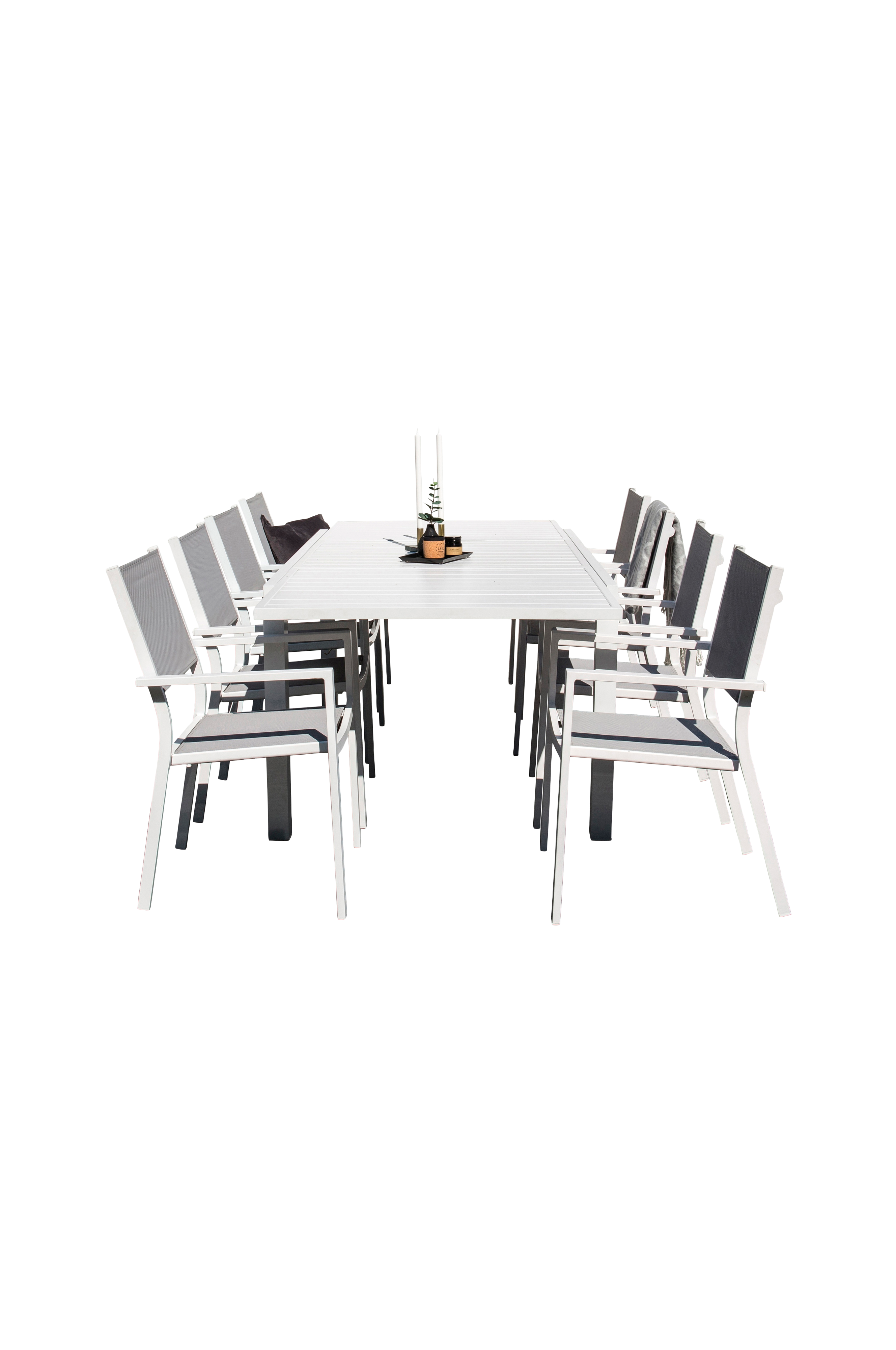 Samanaikaisesti moderni ja ajaton - tämä ruokailuryhmä on takuuvarma menestys kesäterassilla! Marbella-ruokapöytä on jatkettava, joten se sopii siksi erinomaisesti niin pieniin kuin suuriinkin juhliin. Pöytä on alumiinia ja siinä on suorakaiteenmuotoinen pöytälevy ja suora pohjoismainen design. Mukana Copacabana-sarjan ruokapöydän tuolit. Tuolissa on alumiinirakenne ja istuin textileneä, joka kerää katseet. Kätevä ja kestävä ruokapöydän tuoli. Istu mukavasti ja nauti viihtyisistä illallisista ulkona!