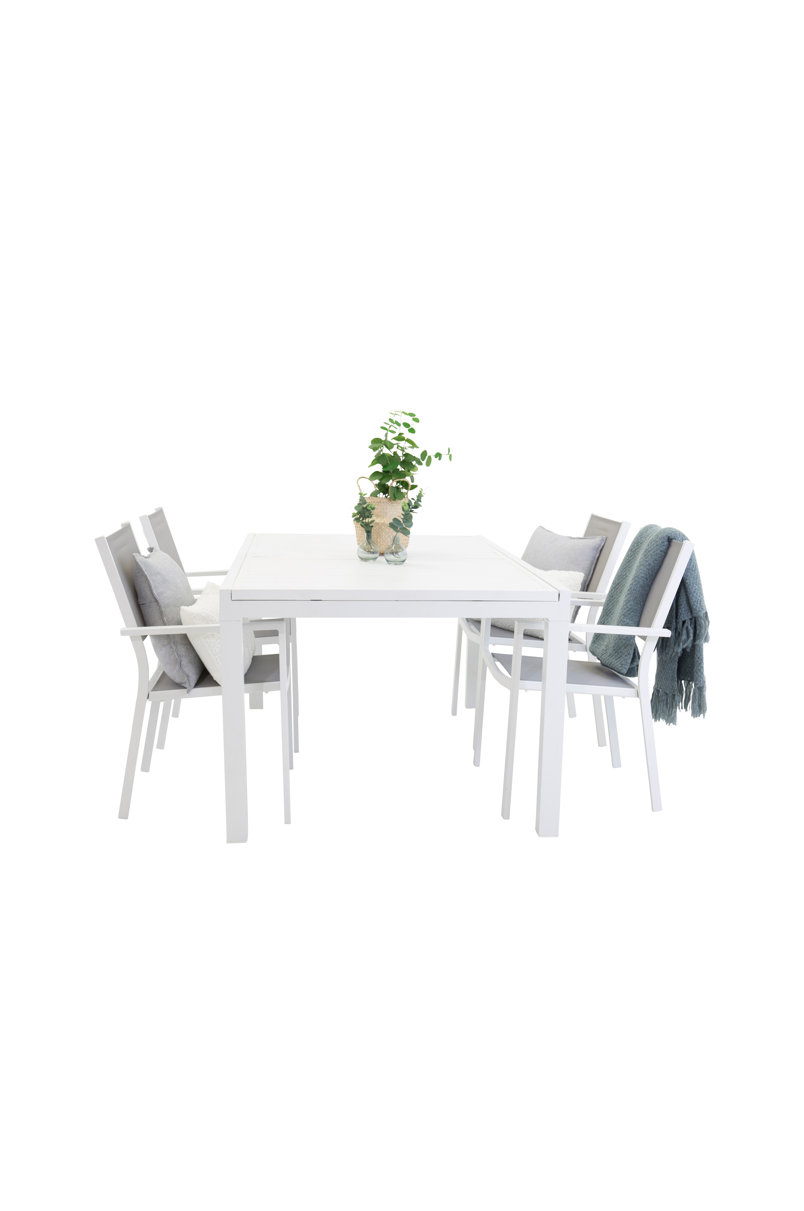 Täydellinen ruokailuryhmä arkeen ja juhlaan! Venture Homen suorakulmainen Marbella-ruokapöytä on jatkettavissa tarpeen mukaan, joten se sopii sekä pienille että isoille seurueille. Pöydässä on suorat pohjoismaiset muodot kiiltävää alumiinia. Tässä tyylikkäässä kokonaisuudessa on Copacabana-sarjan tuolit. Pinottavat tuolit on kätevä säilyttää. Niissä on Textilene-istuin ja suorat alumiinijalat. Nauti monista yhteisistä aterioista pöydän ääressä!
