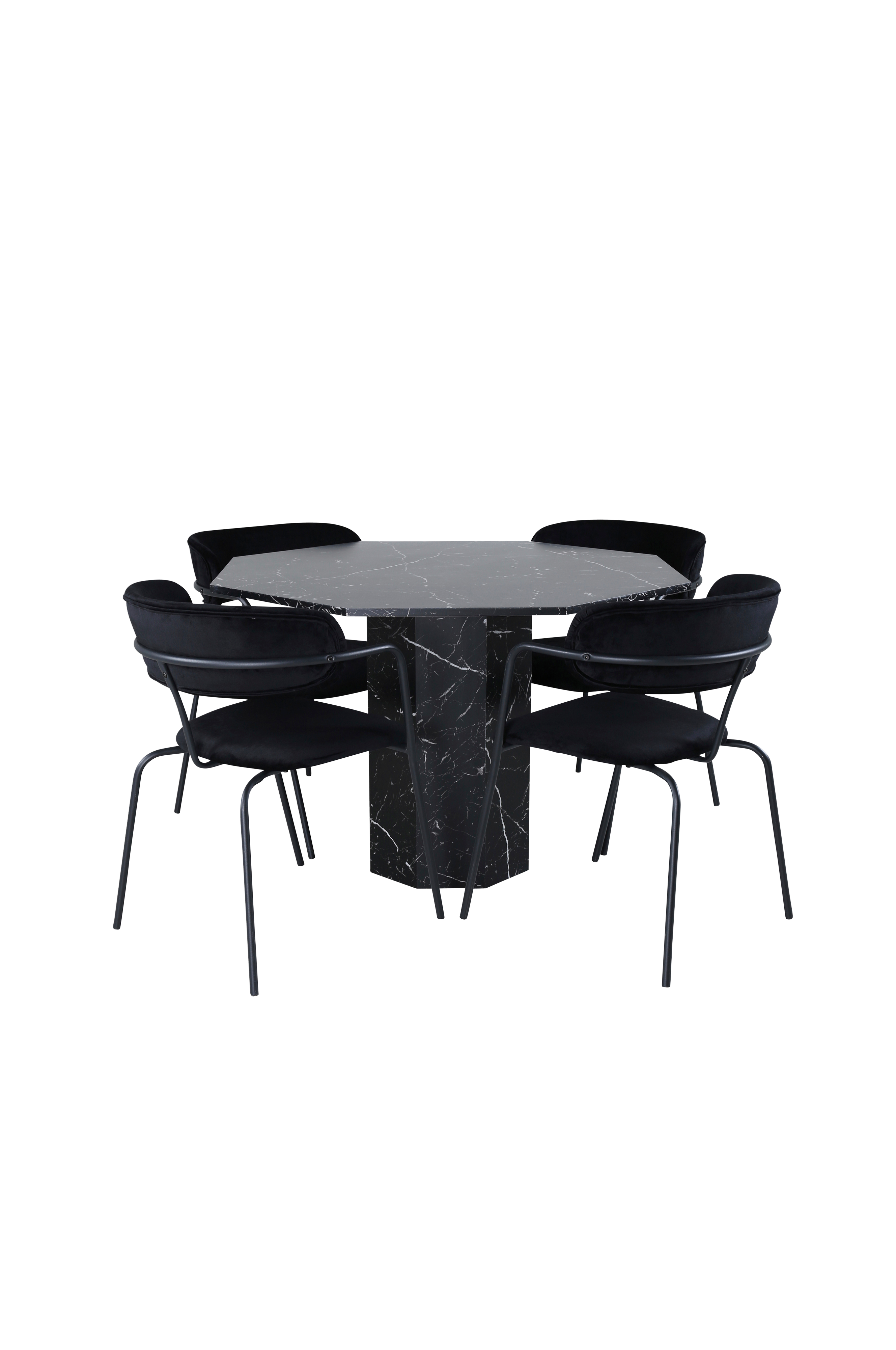 Marbs-ruokapöytä, jossa pyöreä marmorikuvioinen MDF-pöytälevy ja pöydänjalka marmorikuvioista MDF-levyä. Neljä Arrow-tuolia, joissa samettipäällysteinen istuin ja metallijalat. Pöytä ja tuolit on helppo koota. Pöydän mitat: Halkaisija: 110 cm, korkeus: 75 cm. Tuolin mitat: Istuinsyvyys: 43,5 cm, istuinleveys: 47 cm, istuinkorkeus: 47 cm.