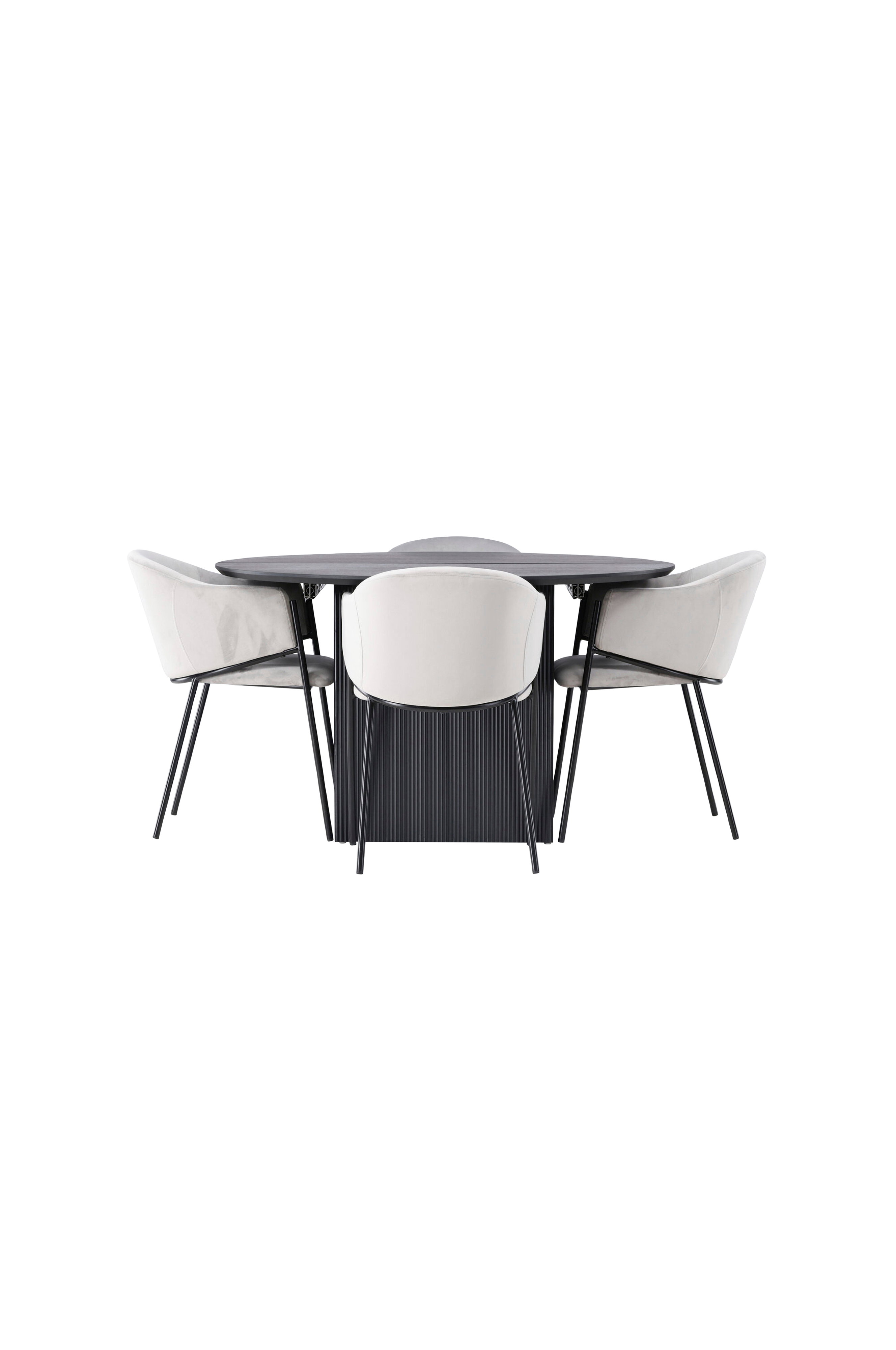 Pyöreä Matilda-ruokapöytä muuntautuu nopeasti soikeaksi pöydäksi jatko-osansa ansiosta. Pyöreä pöytälevy on viilutettua MDF-levyä, ja tukevien, palkkimaisten jalkojen ansiosta Matilda antaa lisäksi modernin ja elegantin säväyksen kotiisi. Olemme yhdistäneet Matilda-ruokapöytään Evelina-tuolit, jotka täydentävät toisiaan parhaalla mahdollisella tavalla. Näissä tuoleissa on moderni ja mukava design, joka välittömästi vangitsee huomiosi. Kokonaan päällystetty samettinen istuin luo ylellisen ja tyylikkään vaikutelman, kun taas pyöristetty selkänoja tarjoaa sekä tukea että mukavuutta pitkillä illallisilla.