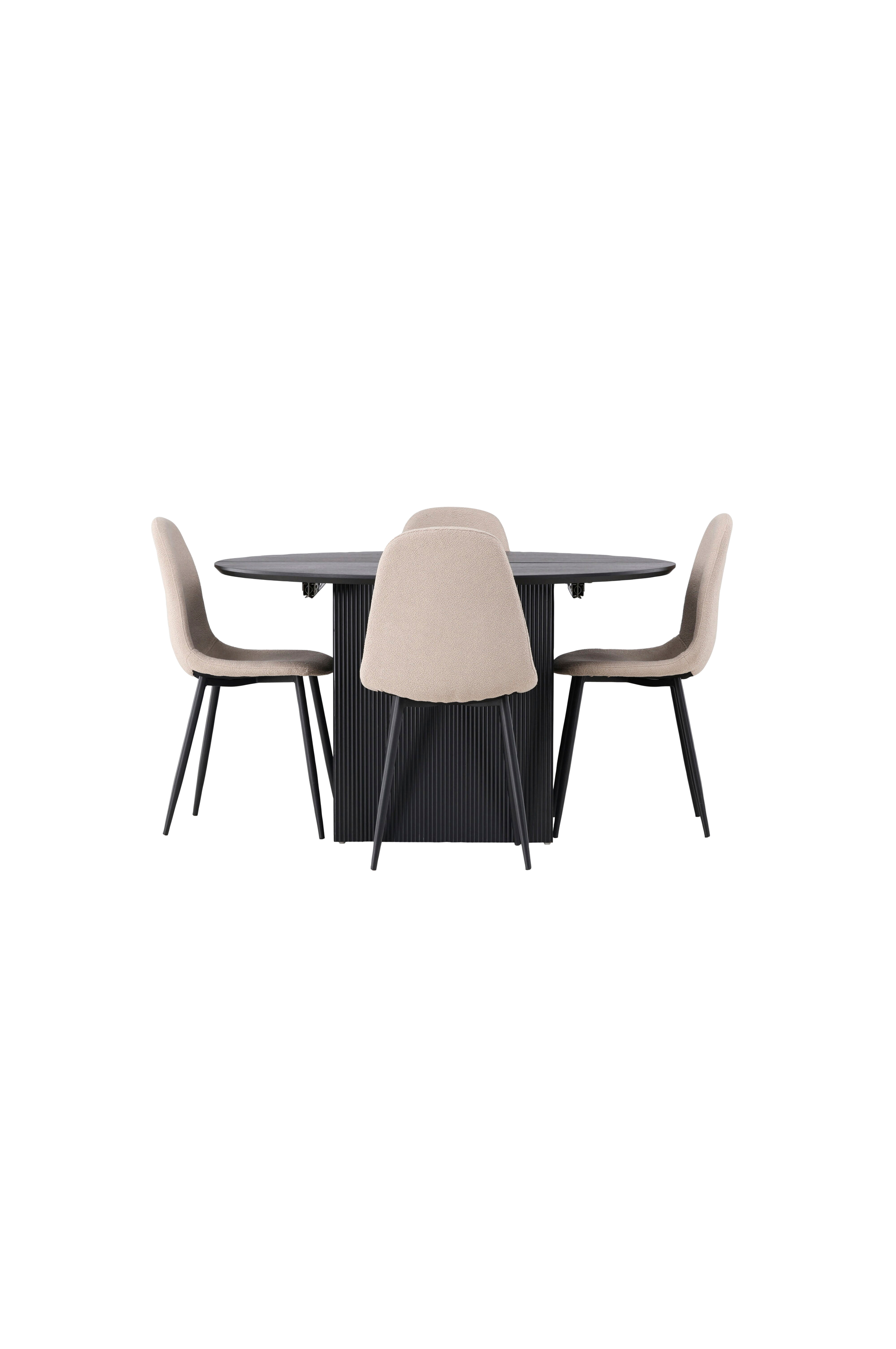 Klassisen värinen pyöreä Matilda-ruokapöytä, jossa pyöreä pöytälevy viilutettua MDF-levyä, tuo modernia ja eleganttia ilmettä kotiisi. Ulkomuodon lisäksi vaikutuksen tekee kätevä toiminto, joka on piilossa pinnan alla. Ruokapöytä on jatkettava, eli se on helppo pidentää soikeaksi pöydäksi useammille vieraille. Enää ei tarvitse ahtautua liian pienen pöydän ääreen! Tuoleissa on kokoverhoilu, joka antaa ylellisen tunteen. Jauhemaalatut metallijalat antavat vakautta ja kontrastia pehmeään ja miellyttävään bukleekankaaseen, jolla selkänoja ja istuinosa on päällystetty. Istuin on lisäksi pehmustettu, minkä ansiosta voit istua mukavasti pitkillä aterioilla.