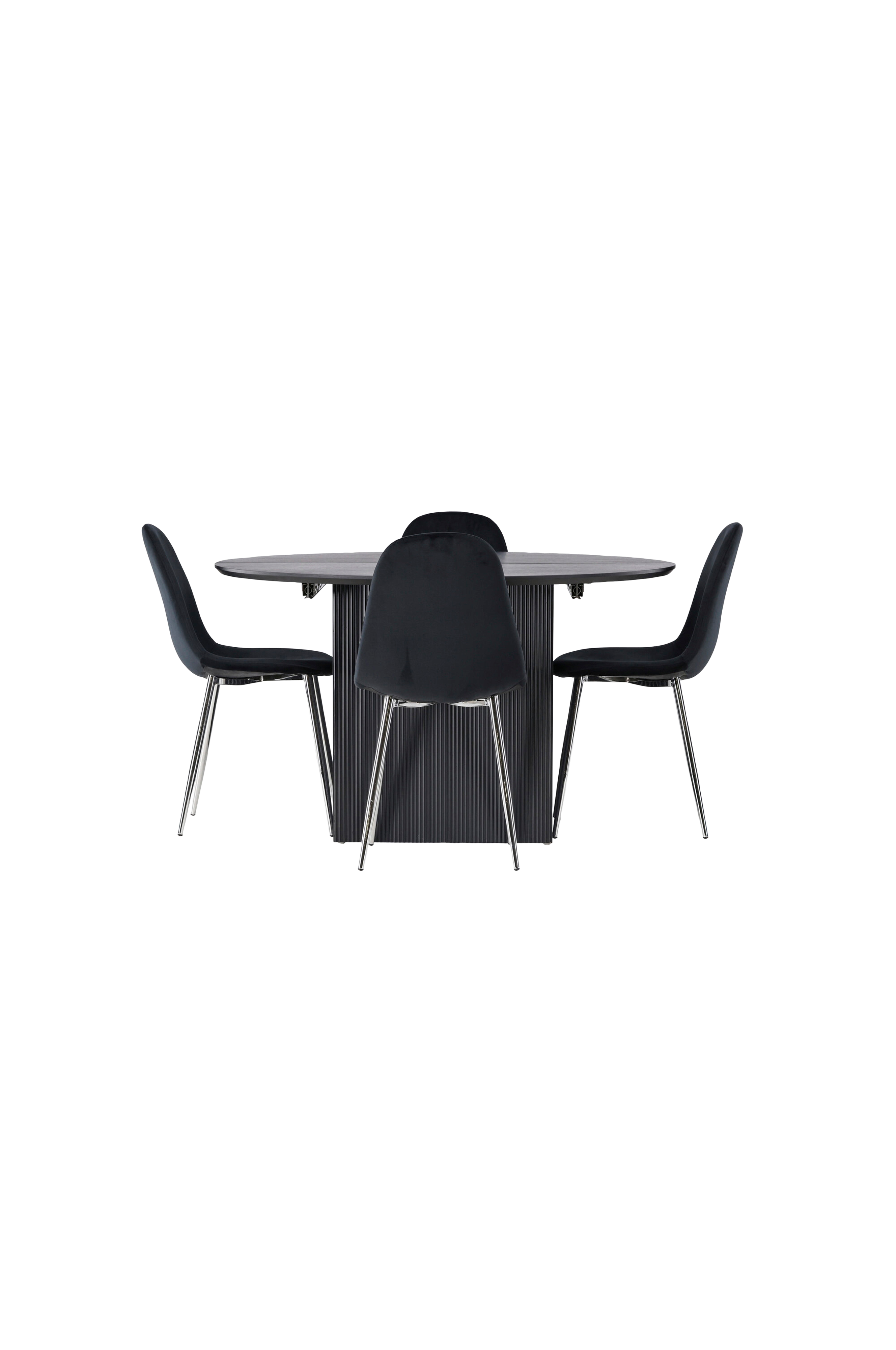 Klassisen värinen pyöreä Matilda-ruokapöytä, jossa pyöreä pöytälevy viilutettua MDF-levyä, tuo modernia ja eleganttia ilmettä kotiisi. Ulkomuodon lisäksi vaikutuksen tekee kätevä toiminto, joka on piilossa pinnan alla. Ruokapöytä on jatkettava, eli se on helppo pidentää soikeaksi pöydäksi useammille vieraille. Enää ei tarvitse ahtautua liian pienen pöydän ääreen! Tuoleissa on kokoverhoilu, joka antaa ylellisen tunteen. Jauhemaalatut metallijalat antavat vakautta ja kontrastia pehmeään ja miellyttävään bukleekankaaseen, jolla selkänoja ja istuinosa on päällystetty. Istuin on lisäksi pehmustettu, minkä ansiosta voit istua mukavasti pitkillä aterioilla.