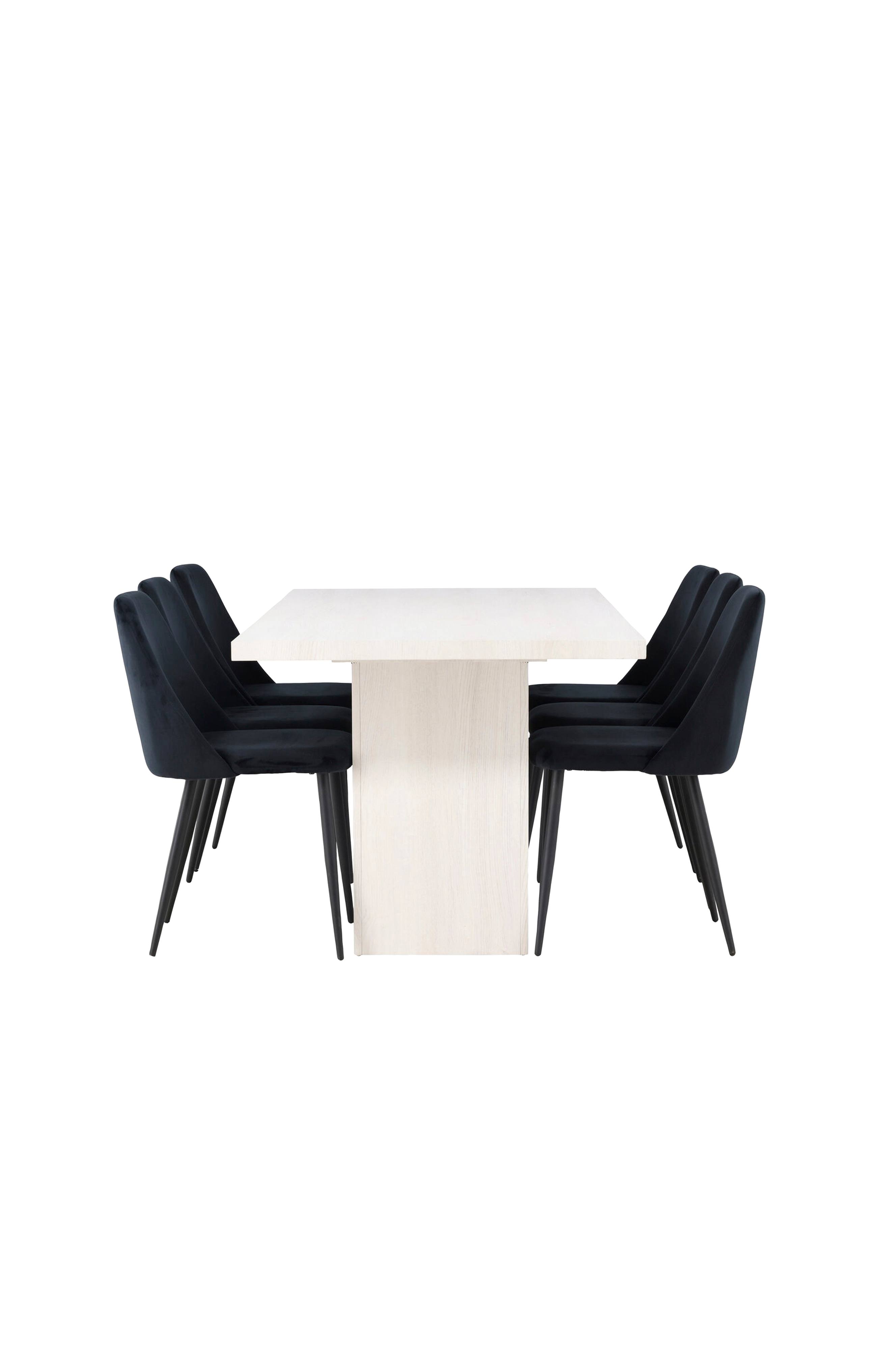 Olga-ruokapöytä tukevalla muodollaan ja skandinaavisella muotoilullaan on ilo silmälle. Suorakulmainen pöytälevy viimeisteltyä MDF-levyä tuo valon ja tilavuuden tunnetta huoneeseen. Tukevat lohkon muotoiset jalat sopivat pöytään täydellisesti ja luovat vakaan perustan aterioille. Night-sarjan samettituolit täydentävät viimeistellyn ruokapöydän täydellisesti.