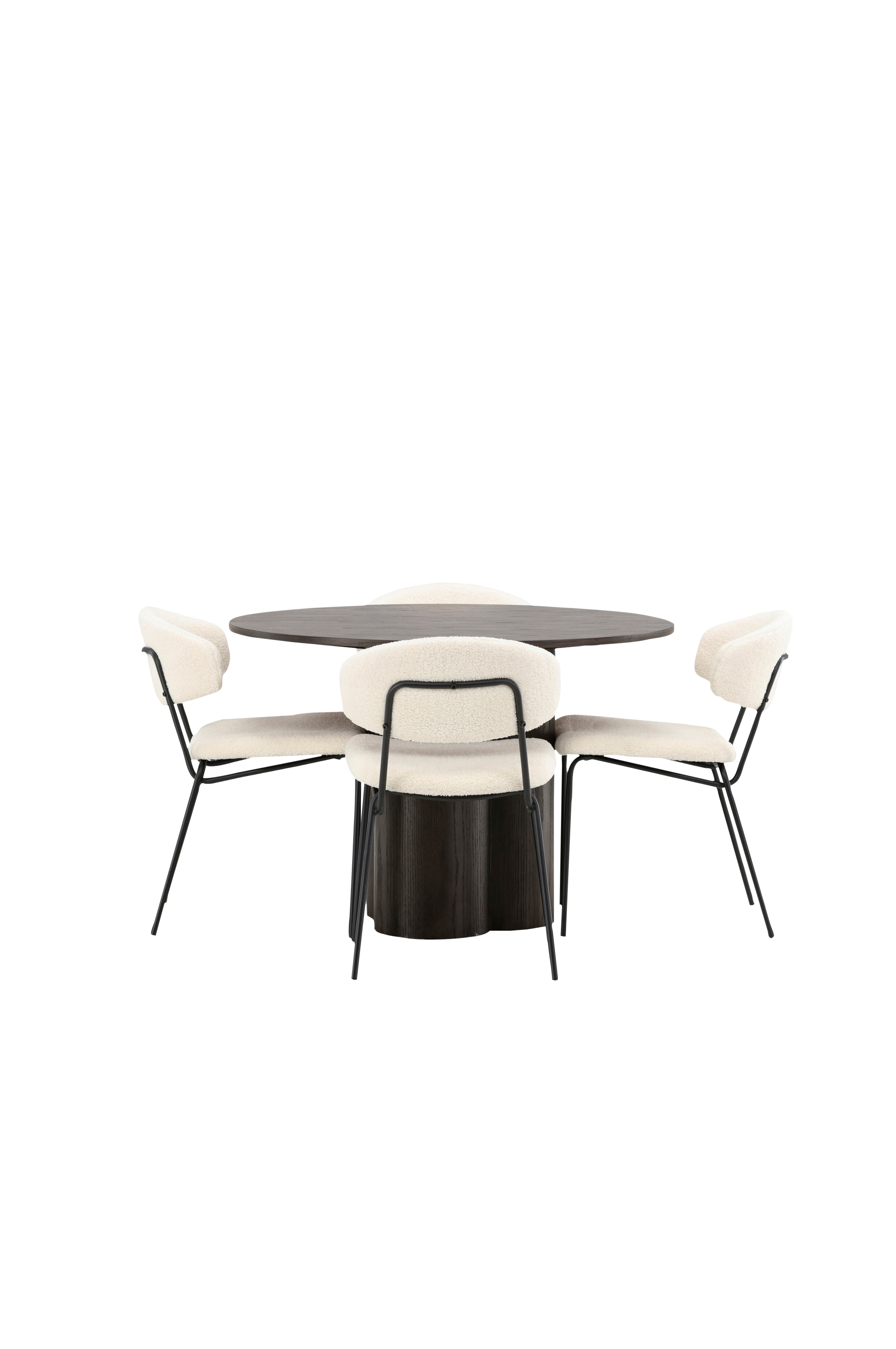 Täydellinen yhdistelmä - tämä ruokailuryhmä tekee vaikutuksen! Olivia-ruokapöytä tekee vaikutuksen skandinaavisella designillaan ja tyylikkäällä muotoilullaan. Pöytä on tyylikkäänväristä MDF-levyä, ja siinä on ohut, pyöreä pöytälevy ja kolme sylinterinmuotoista jalkaa, jotka on sijoitettu pöydän keskiosan alle. Tässä ruokapöytään on yhdistetty Venture Designin Chico-sarjan ruokapöydän tuolit. Tuoleissa on minimalistinen ja mukava muotoilu. Selkänoja ja istuinosa on verhoiltu bukleekankaalla, ja kapea runko on terästä. Kodikas katseenvangitsija kotiisi!