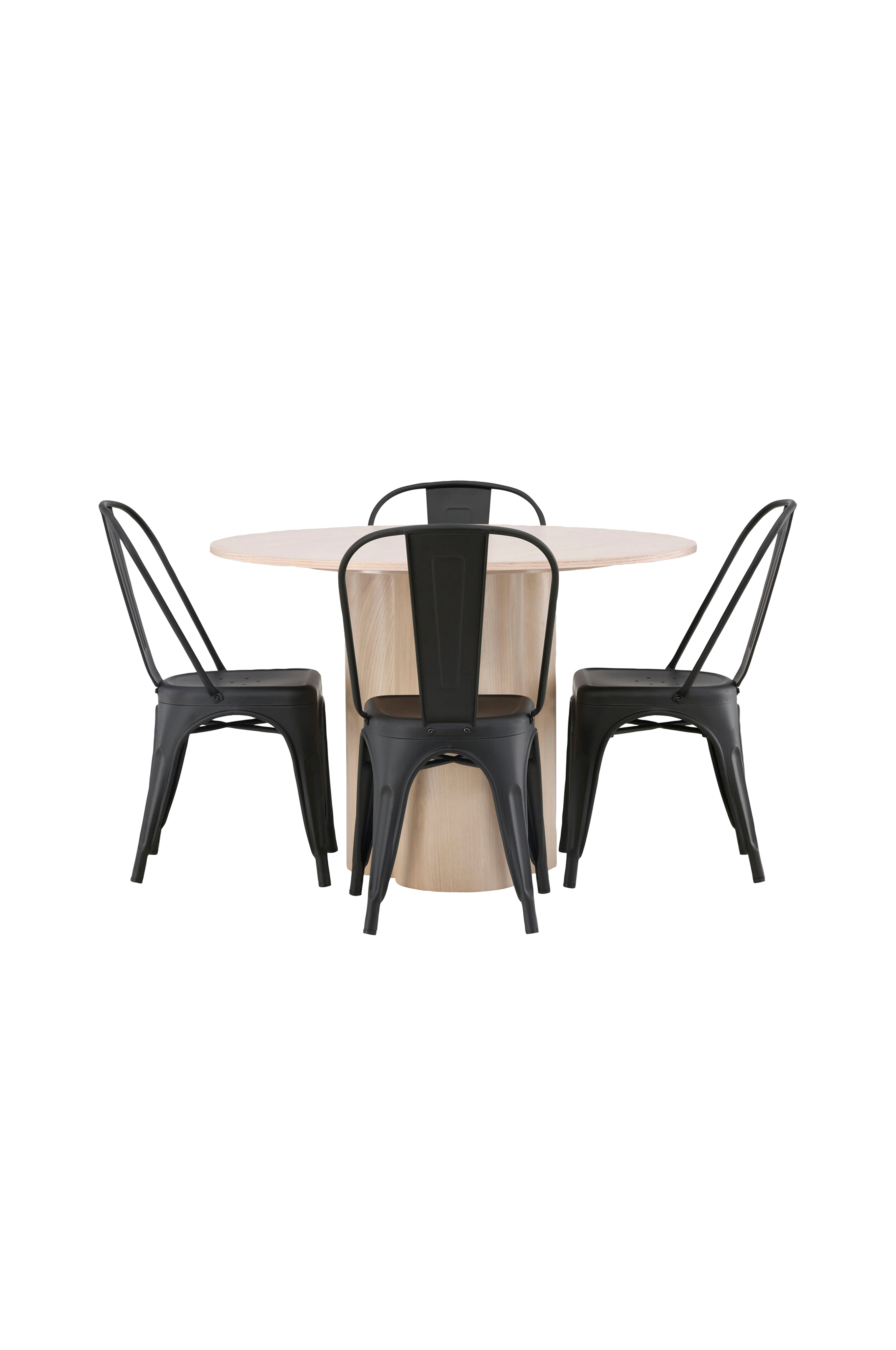 Näyttävä ruokailuryhmä sopii erinomaisesti moderniin kotiin! Olivia-ruokapöydässä on tyylikäs skandinaavinen design ja vankka muoto. Pöytä on kokonaan viimeisteltyä MDF-levyä, ohut pyöreä pöytälevy ja kolme sylinterinmuotoista jalkaa, jotka ovat yhdessä pöydän keskiosan alla. Tässä ruokapöytään on yhdistetty neljä Tempe-sarjan ruokapöydän tuolia. Tuolissa on hieman levenevät jalat sekä tyylikkäästi muotoitu istuin ja selkänoja, kaikki metallia. Kutsu ystävät koolle viettämään aikaa yhdessä - kenenkään ei tarvitse istua reunassa!