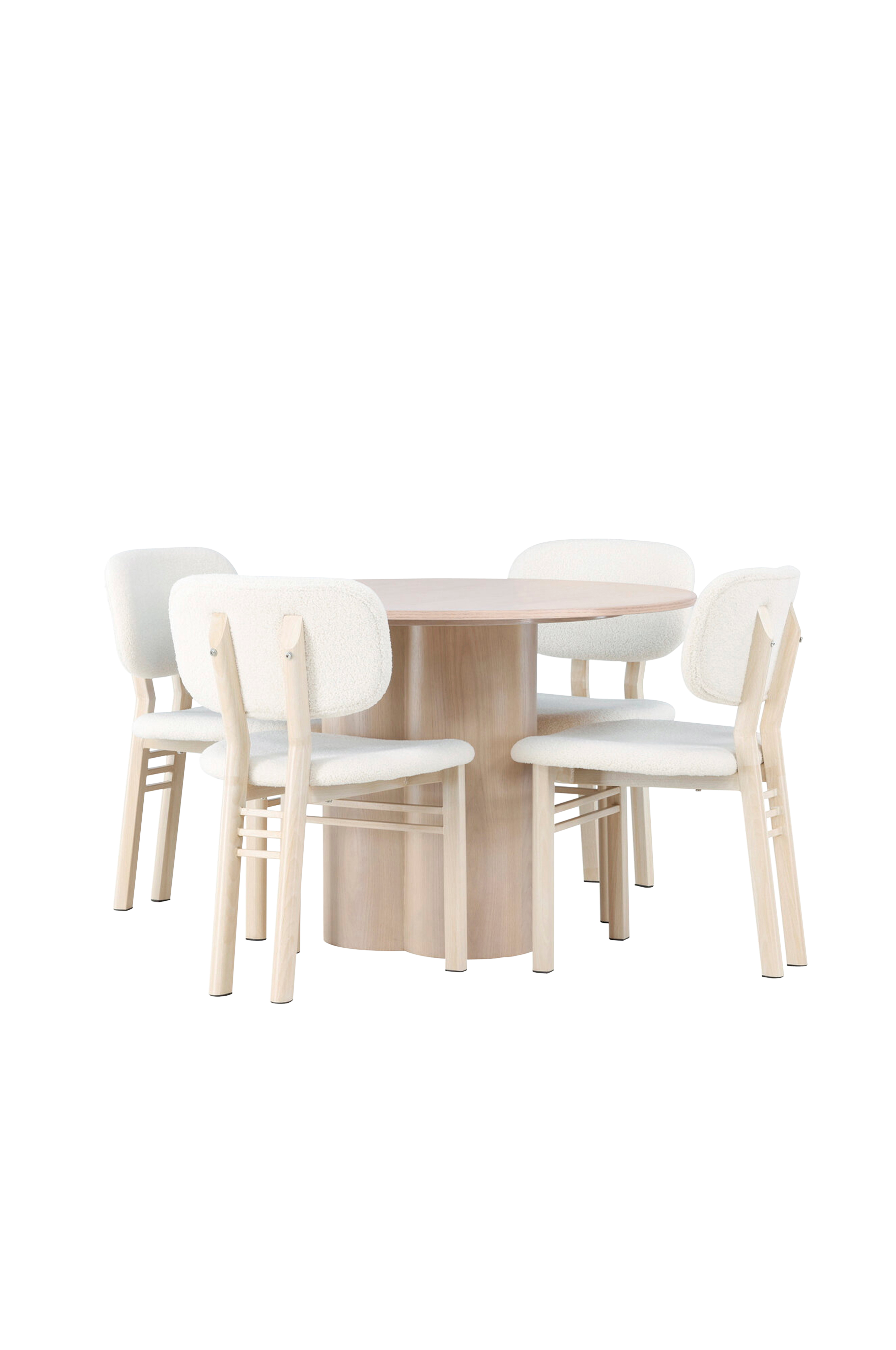Olivia-sarjan ruokapöytä on yksinkertaisuudessaan ainutlaatuinen. Kestävä MDF-levy ja viimeistelty pinta luovat pelkistettyä ja modernia tunnelmaa. Ohut, pyöreä pöytälevy tuo hillittyä eleganssia, ja kolme lieriönmuotoista jalkaa pöydän keskellä muodostaa vakaan perustan. Olivia-pöytään on yhdistetty Sia-sarjan modernit ruokapöydän tuolit, jotka ovat sekä mukavat että tyylikkäät. Sia-tuolin ihanan vaalea väri tuo raikkautta ja ilmavuutta kotiisi. Istuinosa ja selkänoja on verhoiltu bukleekankaalta, joka näyttää elegantilta ja tuntuu pehmeältä ja miellyttävältä istuessasi. Puujalat tuovat tuoliin luonnollista ja rustiikkia ilmettä.