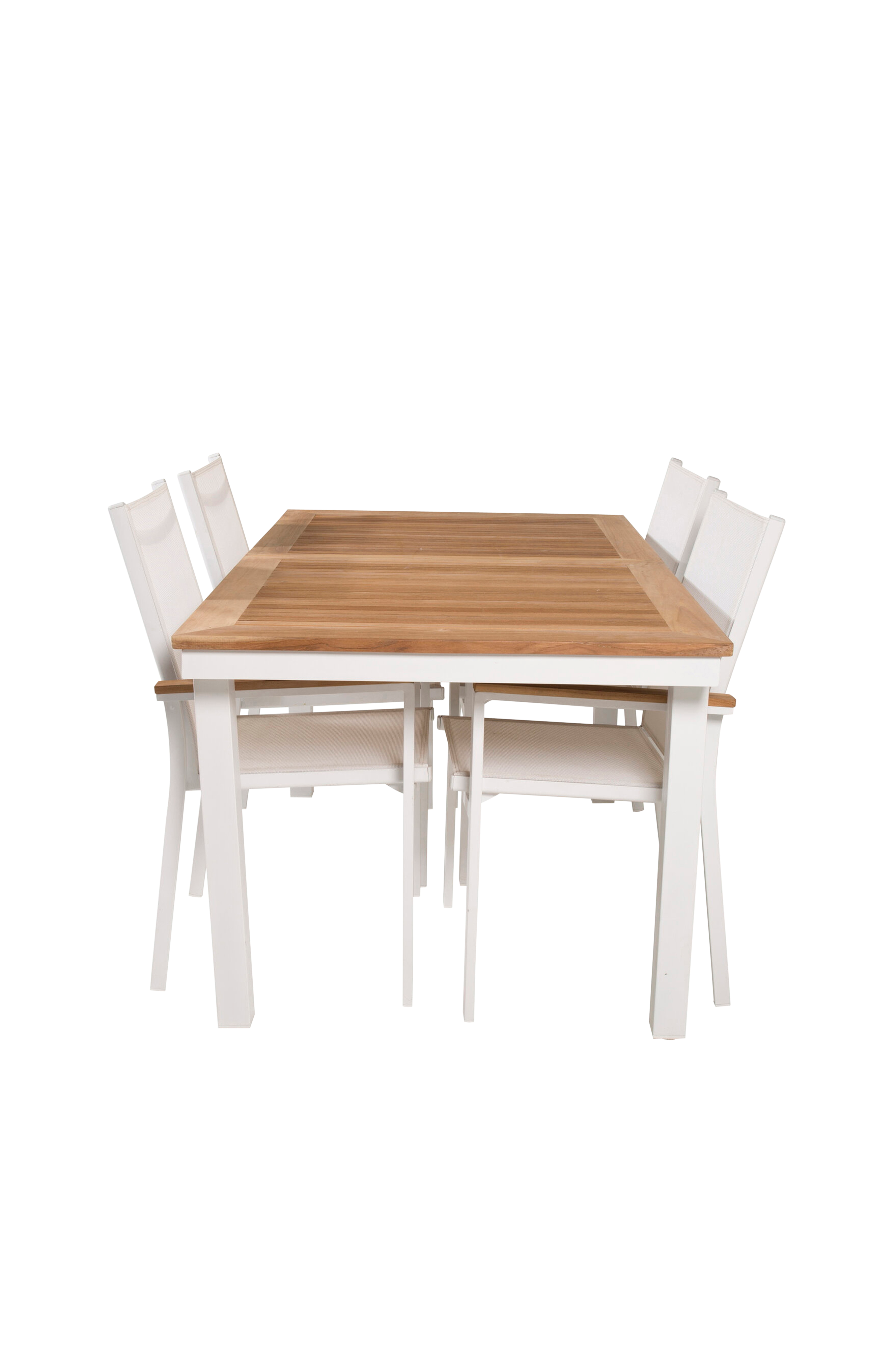 Valmiin ruokailuryhmän hankkiminen on sekä trendikästä että käytännöllistä! Tyylikkääseen Panama-ruokapöytään on yhdistetty Texas-sarjan ruokapöydän tuolit. Ruokailuryhmässä yhdistyvät tyylikkäästi tiikkinen pöytälevy ja käsinojien tiikkiyksityiskohdat. Ruokailuryhmässä istut mielellään pitkään ja nautit hyvästä ruoasta ja seurasta!