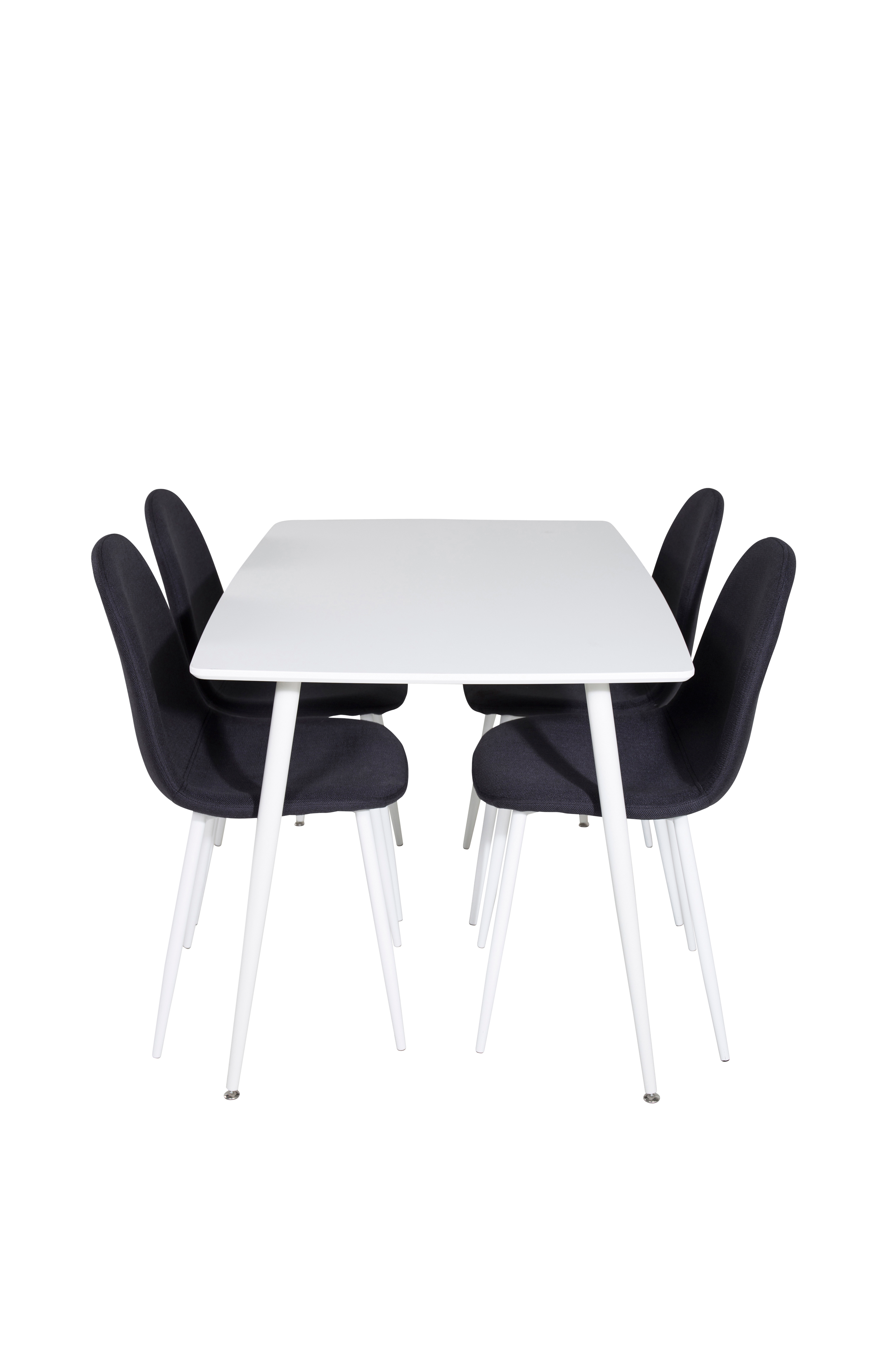 Penally-ruokapöytä, jossa MDF-pöytälevy ja metallijalat. Neljä Penally-tuolia, joissa istuin polyesteriä ja metallijalat. Pöytä ja tuolit on helppo koota. Pöydän mitat: Pituus: 120 cm, leveys: 80 cm, korkeus: 75 cm. Tuolin mitat: Istuinsyvyys: 39,5 cm, istuinleveys: 41 cm, istuinkorkeus: 45,5 cm.