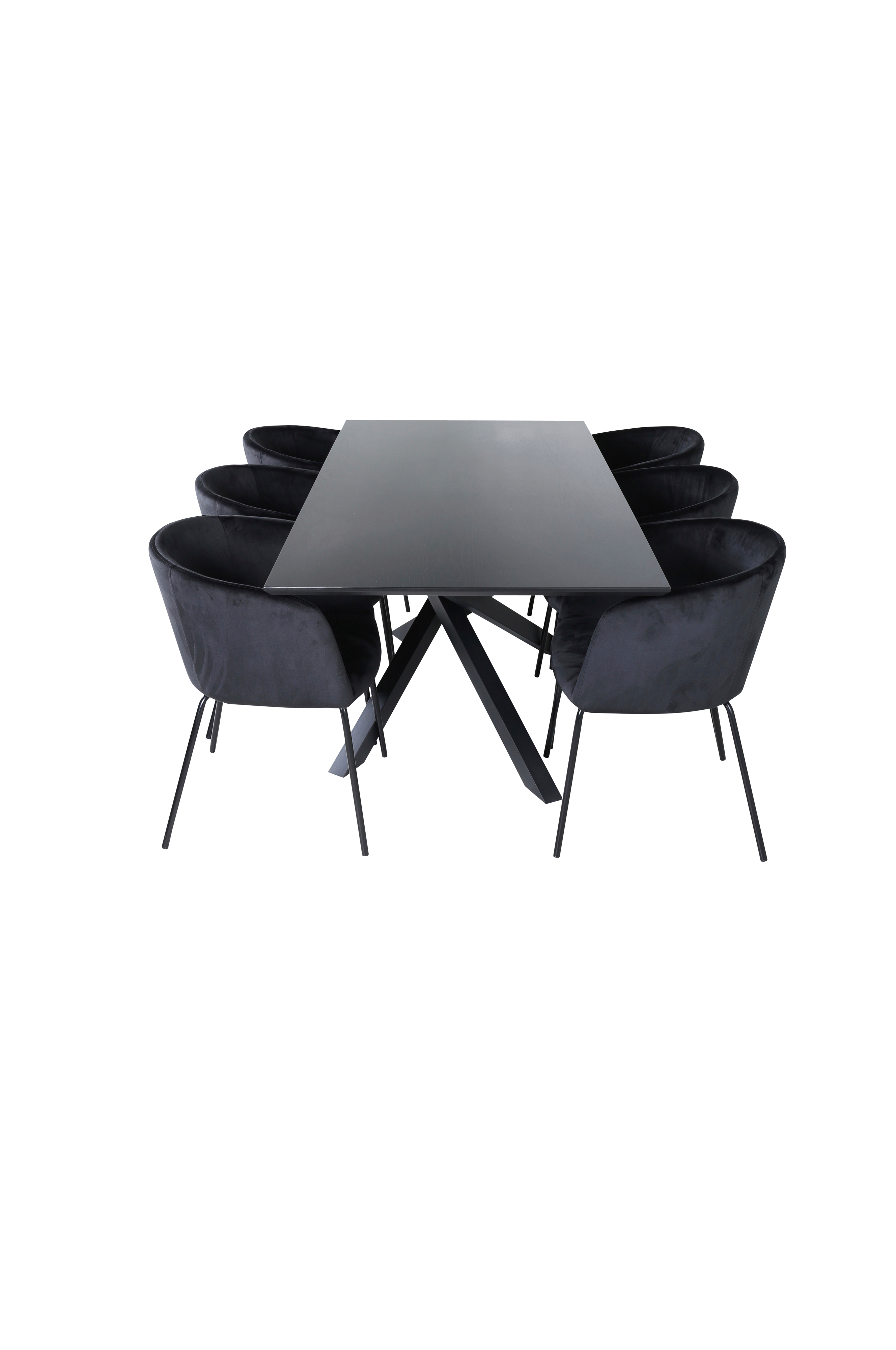 Piazza-ruokapöytä, jossa pöytälevy viilutettua MDF-levyä ja jalat rautaa. Kuusi Berit-tuolia, joissa samettipäällysteinen istuinosa ja rautajalat. Pöytä ja tuolit on helppo koota. Pöydän mitat: Pituus: 190 cm, leveys: 90 cm, korkeus: 76 cm. Tuolin mitat: Istuinsyvyys: 45 cm, istuinleveys: 55 cm, istuinkorkeus: 49 cm.