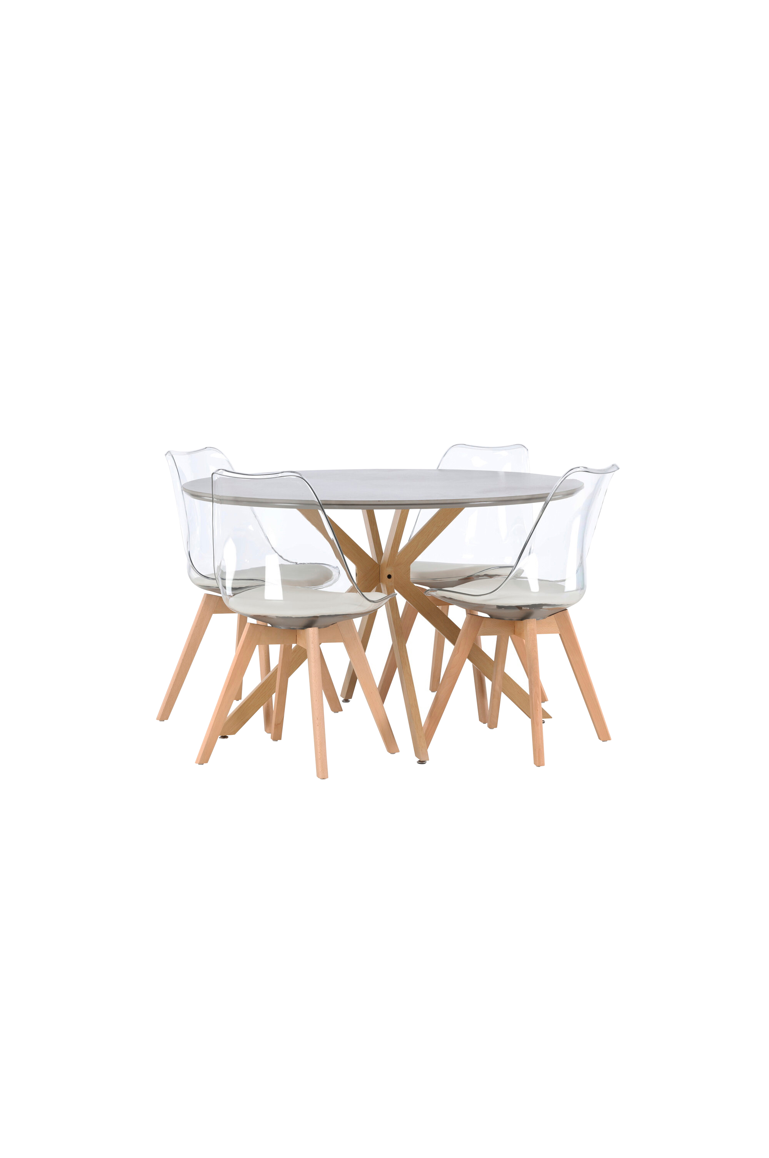 Pyöreä Piazza-ruokapöytä on erinomainen valinta tyylitietoiselle, joka etsii ainutlaatuista ruokapöytää isoon keittiöön tai olohuoneeseen. Pöydässä on pyöreä pöytälevy kaunista Spraystone-materiaalia ja runkona koristeelliset ristikkäiset puujalat. Tässä upeassa kokonaisuudessa on Edvin-sarjan tyylikkäät ruokapöydän tuolit. Tuolin läpinäkyvä PET-istuin huokuu trendikkyyttä ja tuo ilmavaa tunnetta sisustukseen.