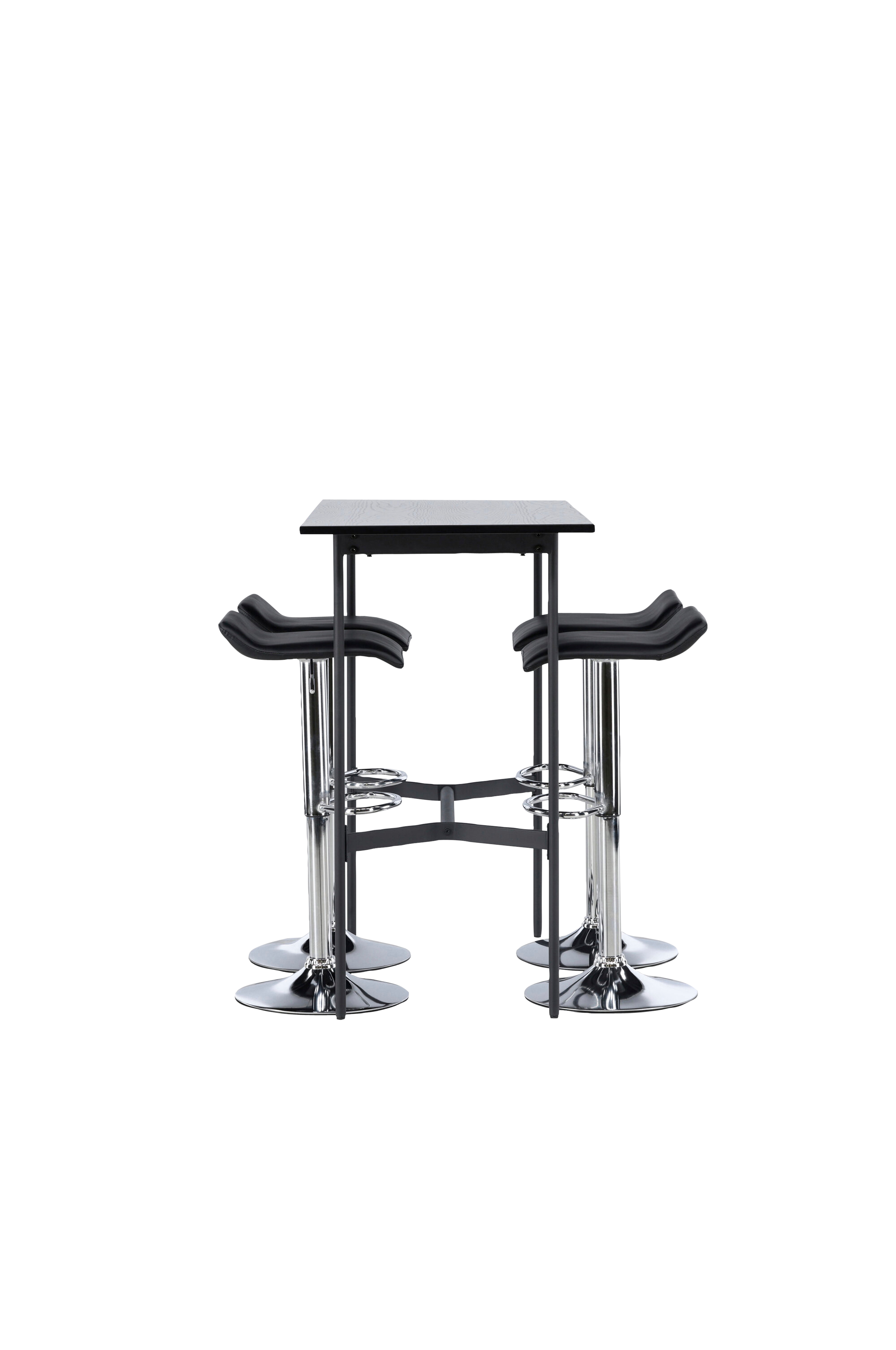 Pelkistetty baariryhmä, jossa trendikäs design! Minimalistisessa Rax-baaripöydässä on ohut MDF-pöytälevy ja kapeat metallijalat, joissa on integroitu jalkatuki. Tässä kokonaisuudessa on Jonna-sarjan baarituolit. Tuoleissa on tyylikäs muotoilu, trumpettijalka on kromattua terästä ja pelkistetty istuinosa tekonahkaa. Kohota sisustuksesi uudelle tasolle!