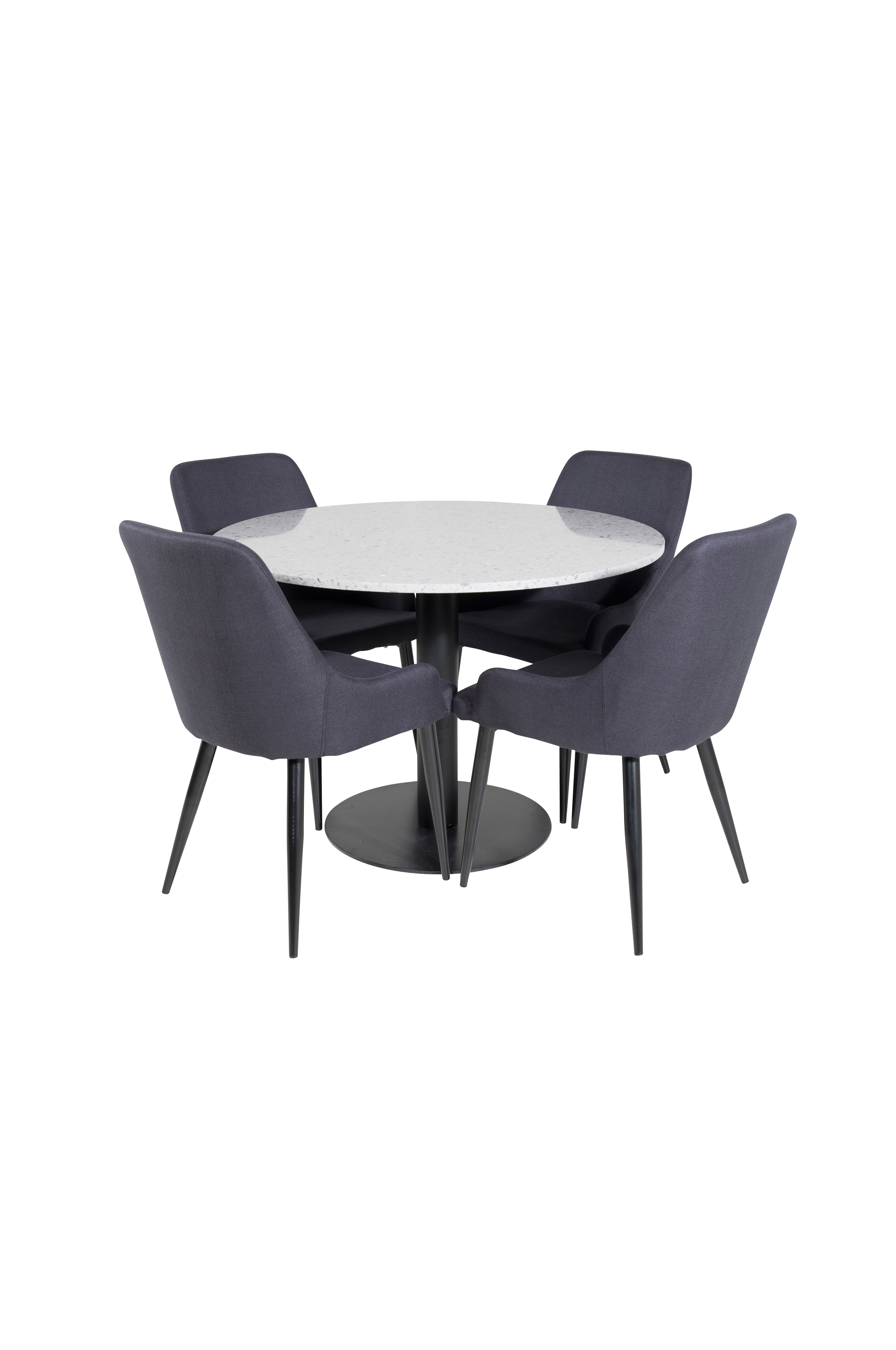 Razzia-ruokapöytä, jossa pyöreä Terrazzo-pöytälevy ja metallijalka. Neljä Plaza-tuolia, joissa polyesteripäällysteinen istuinosa ja metallijalat. Pöytä ja tuolit on helppo koota. Pöydän mitat: Halkaisija: 106 cm, korkeus: 75 cm. Tuolin mitat: Istuinleveys: 46 cm, istuinsyvyys: 45 cm, istuinkorkeus: 47 cm.