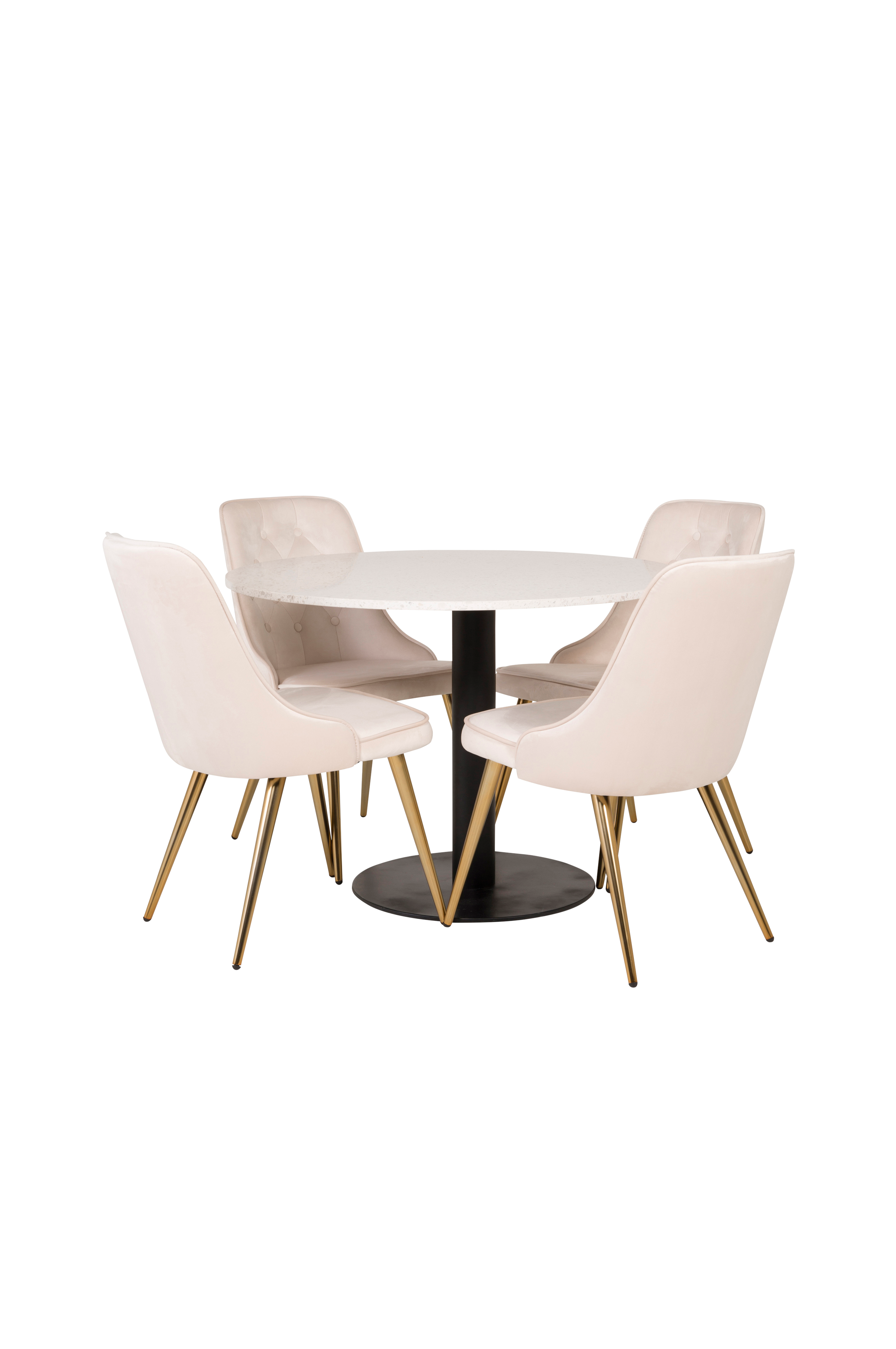 Razzia-ruokapöytä, jossa pyöreä Terrazzo-pöytälevy ja metallijalka. Neljä Velvet Deluxe -tuolia, joissa samettipäällysteinen istuinosa ja metallijalat. Pöytä ja tuolit on helppo koota. Pöydän mitat: Halkaisija: 106 cm, korkeus: 75 cm. Tuolin mitat: Istuinleveys: 50 cm, istuinsyvyys: 49 cm, istuinkorkeus: 49 cm.