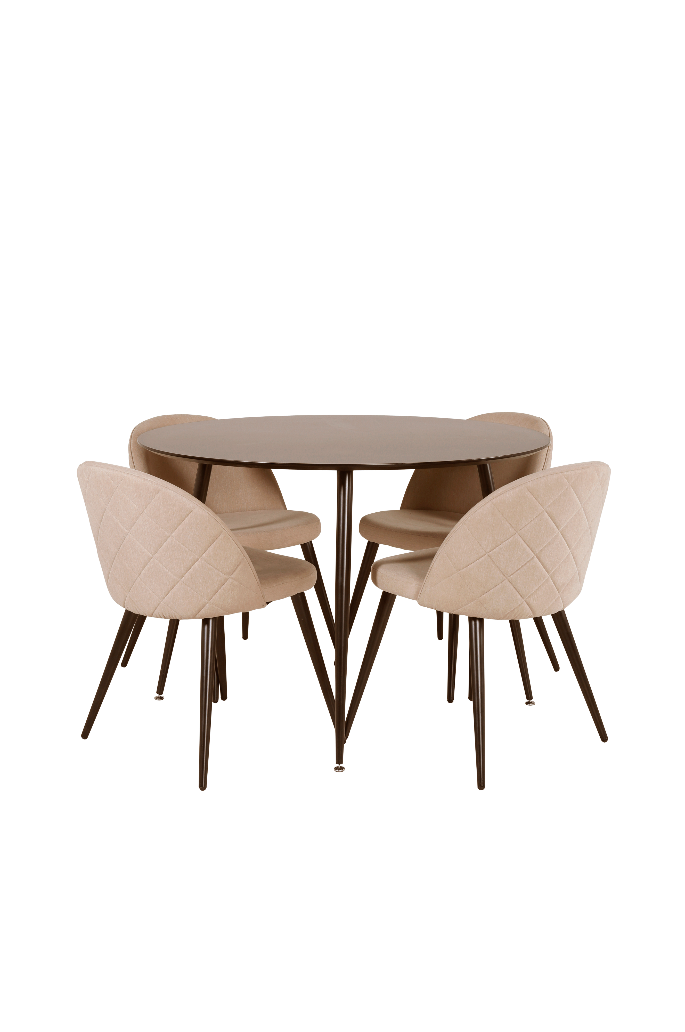 Silar-ruokapöytä, jossa pyöreä MDF-pöytälevy ja metallijalat. Neljä Velvet Stitches -tuolia. Istuinosassa pellavapolyesteripäällinen, jossa koristesaumat. Rautajalat. Pöytä ja tuolit on helppo koota. Pöydän mitat: Halkaisija: 100 cm, korkeus: 75 cm. Tuolin mitat: Istuinsyvyys: 42,5 cm, istuinleveys: 41 cm, istuinkorkeus: 46,5 cm.