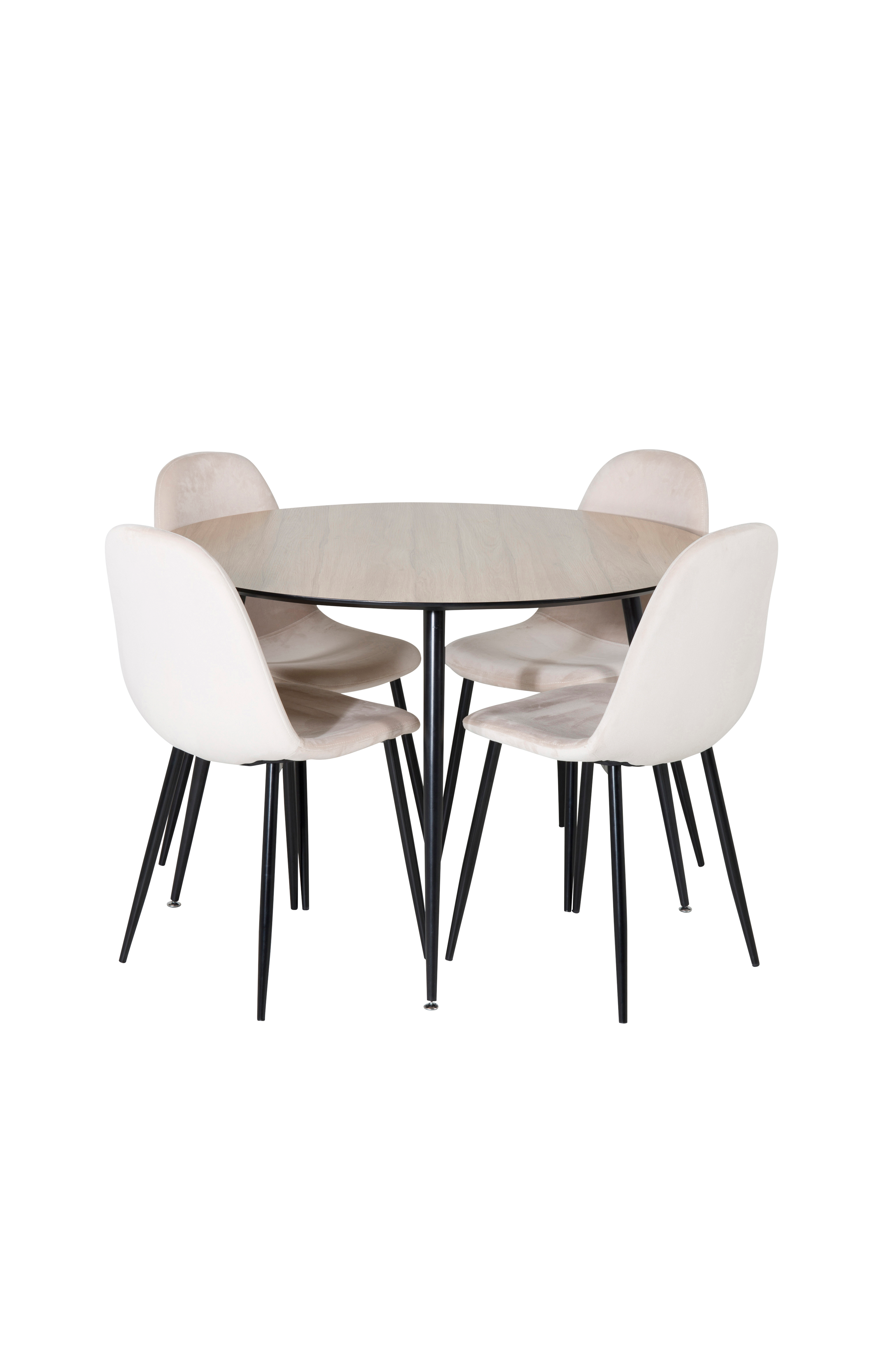 Solhem-ruokapöytä, jossa MDF-pöytälevy ja metallijalat. Neljä Penally-tuolia, joissa samettipäällysteinen istuin ja metallijalat. Pöytä ja tuolit on helppo koota. Pöydän mitat: Halkaisija: 100 cm, korkeus: 75 cm. Tuolin mitat: Istuinsyvyys: 39 cm, istuinleveys: 44 cm, istuinkorkeus: 41,5 cm.