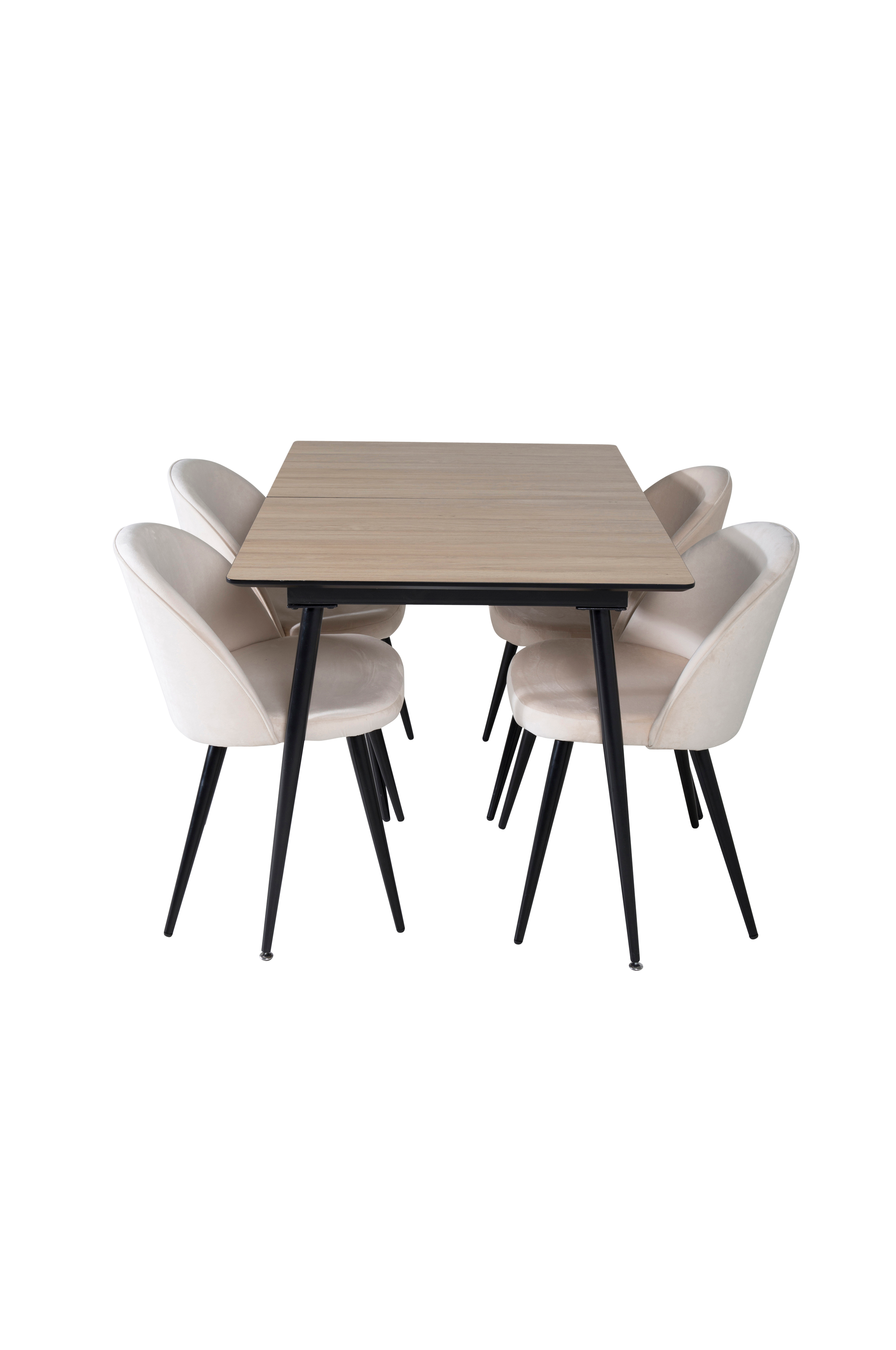 Jatkettava Solhem-ruokapöytä, jossa MDF-pöytälevy ja metallijalat. Pöydän pituus on jatkettuna 160 cm. Neljä Valleta-tuolia, joissa samettipäällysteinen istuin ja metallijalat. Pöytä ja tuolit on helppo koota.