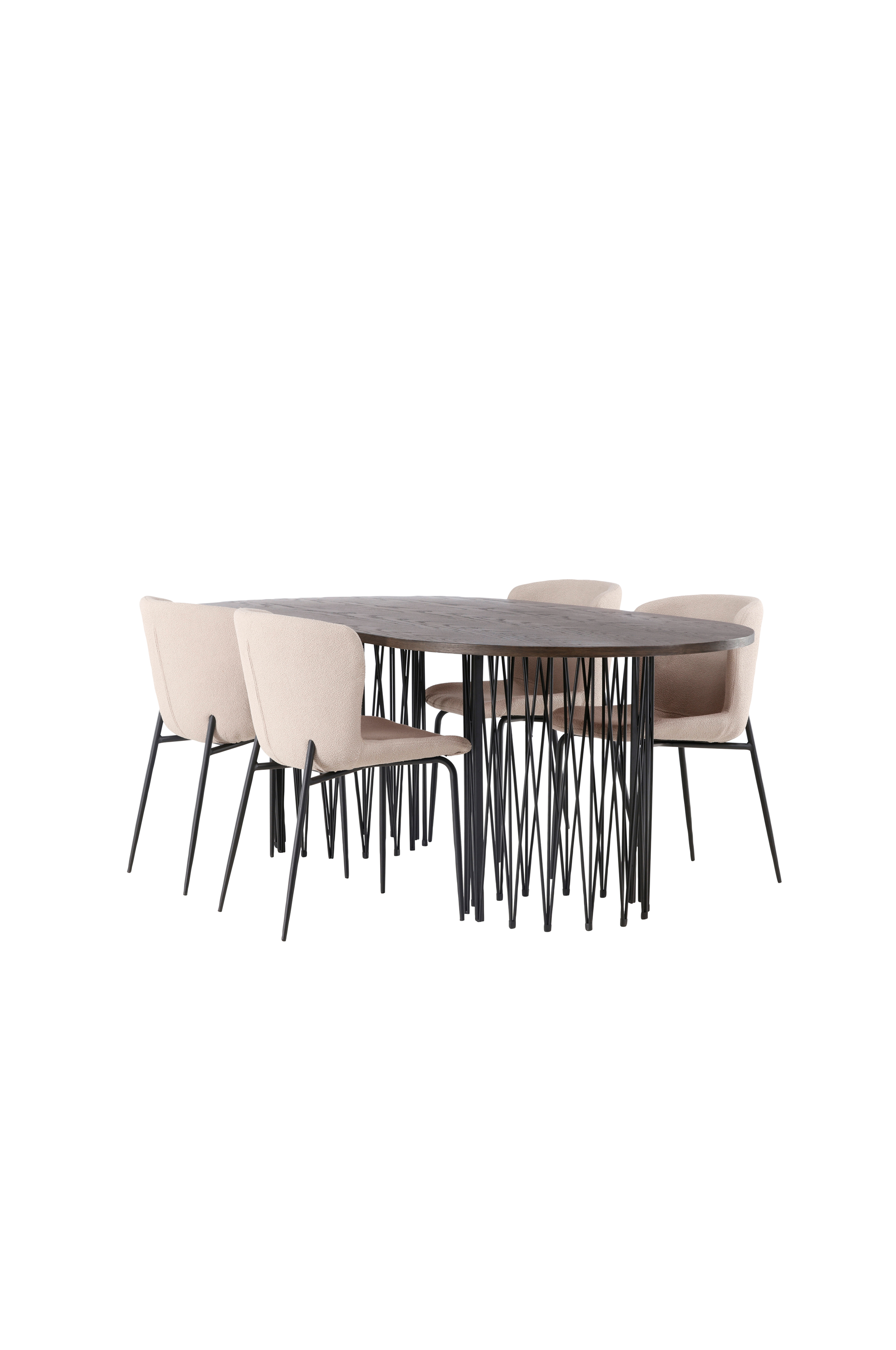 Kutsuva kodin keskipiste! Soikean Stone-ruokapöydän tyylikäs muotoilu tekee vaikutuksen. Kaunis pöytälevy on viilutettua MDF-levyä, ja sitä kannattelee kaksi koristeellista lieriönmuotoista metallista jalustaa. Viehättävän kokonaisuuden täydentävät Modesto-sarjan tuolit. Tuolit on verhoiltu kauttaaltaan pörröisellä kankaalla, ja niissä on tyylikkäät kapeat metallijalat. Hieman pyöristetyn selkänojan ja pehmustetun istuintyynyn ansiosta pöydän ääressä on helppo viihtyä pitkäänkin. Mukavia ateriahetkiä hyvässä seurassa!
