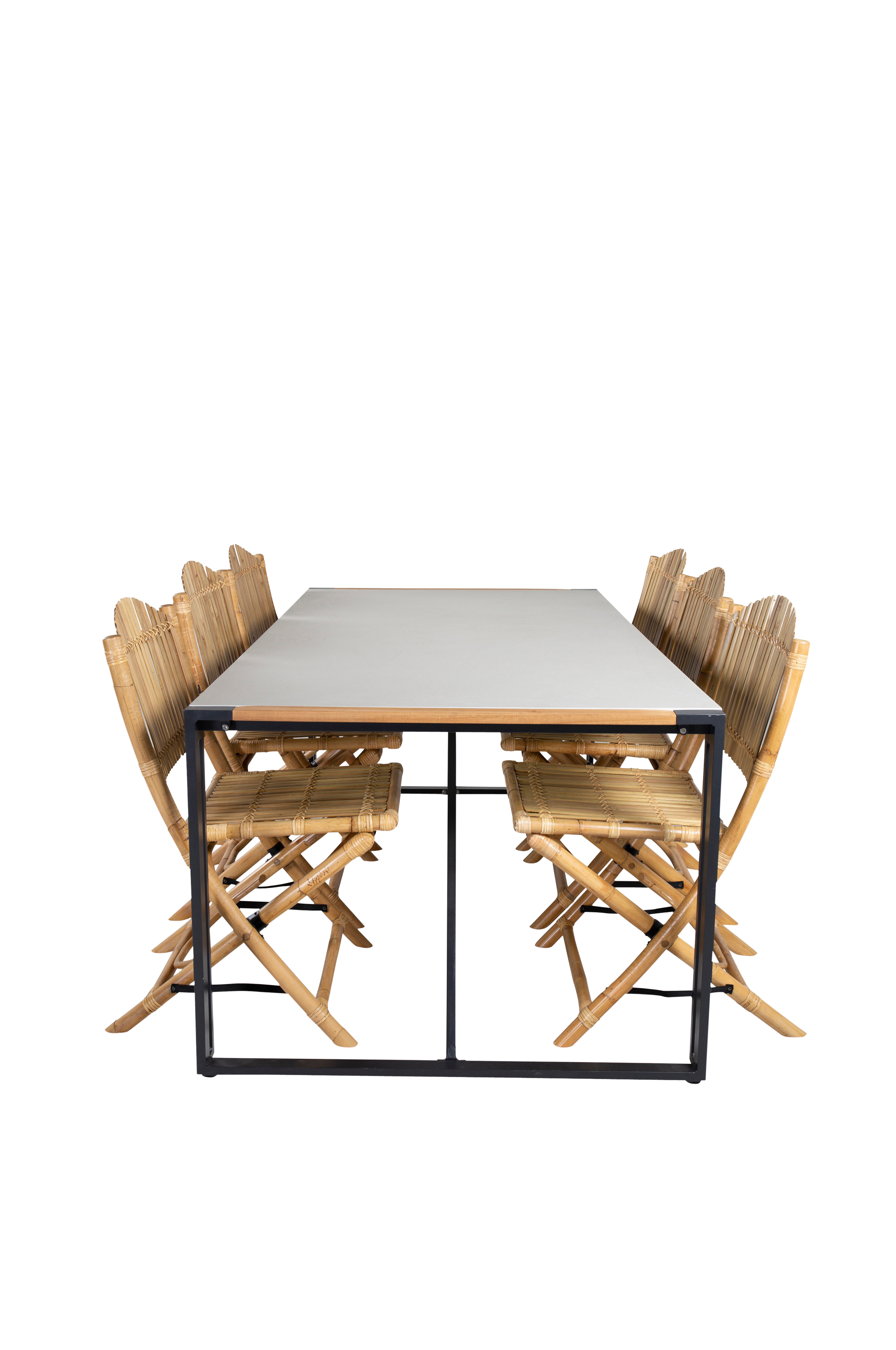 Vaikuttava ruokailuryhmä - luo moderni katseenvangitsija ulkotilaan! Suosittu Texas-ruokapöytä, jossa trendikäs design. Suorakaiteenmuotoinen lasinen pöytälevy, jossa koristereuna tiikkiä. Näyttävä jalusta metallia. Mukana Cane-sarjan upeat bambutuolit, joissa on trooppinen ja ylellinen look. Kalusta ulkotila harmoniseksi ja kutsuvaksi tänä kesänä!