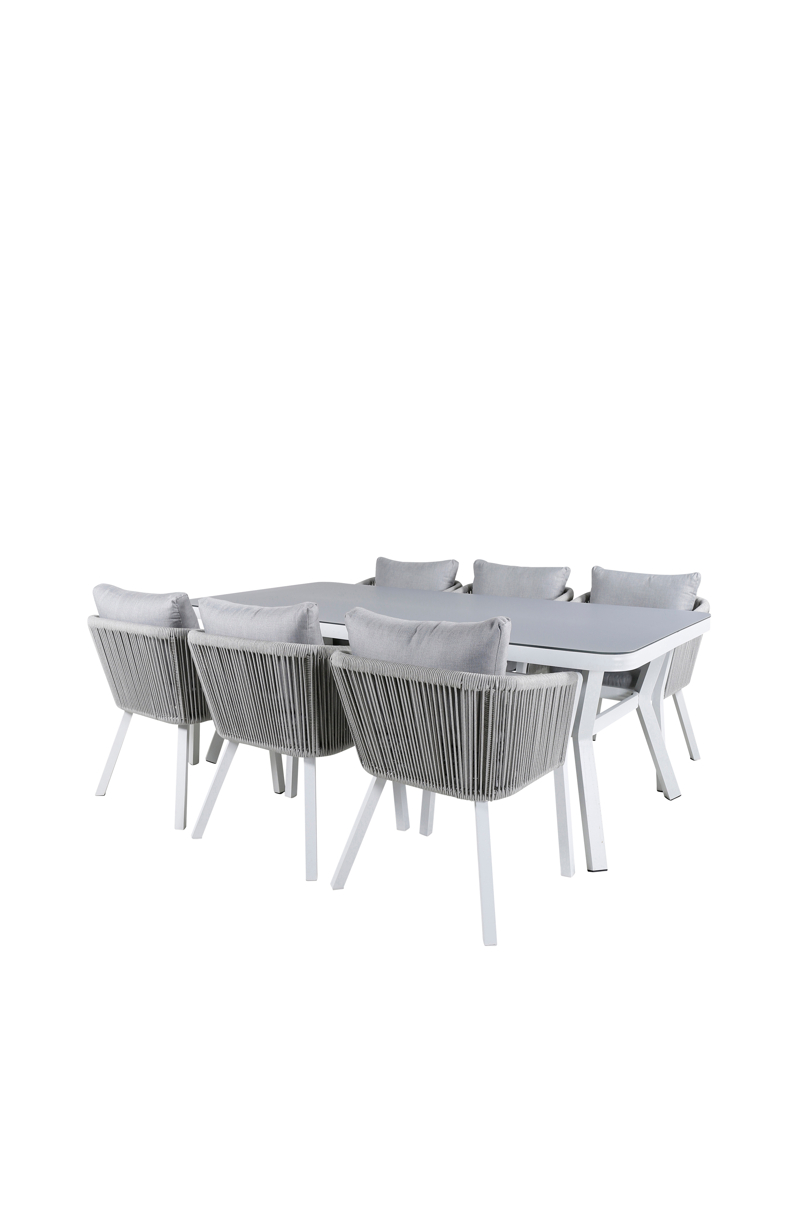 Virya-ruokapöydässä on lasinen pöytälevy ja alumiinijalat. Ryhmään kuuluu 6 Virya-tuolia, joiden istuinosa on polyesteriä ja jalat alumiinia. Mukana istuintyynyt. Pöytä ja tuolit on helppo koota. Pöydän mitat: Pituus: 200 cm, leveys: 100 cm, korkeus: 74 cm. Tuolin mitat: Istuinleveys: 43 cm, istuinsyvyys: 50 cm, istuinkorkeus: 41 cm.